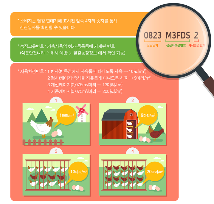 모든 계란의 껍데기에 숫자가 입력되어있어 계란의 산란일, 생산자, 사육환경을 알 수 있습니다.