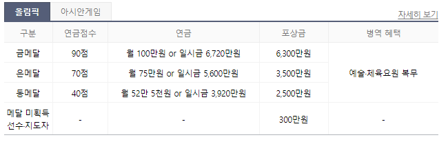 ※ 금메달의 경우 일시금 6,720만원! 국가에서 주는 연금으로 세금은 비과세!