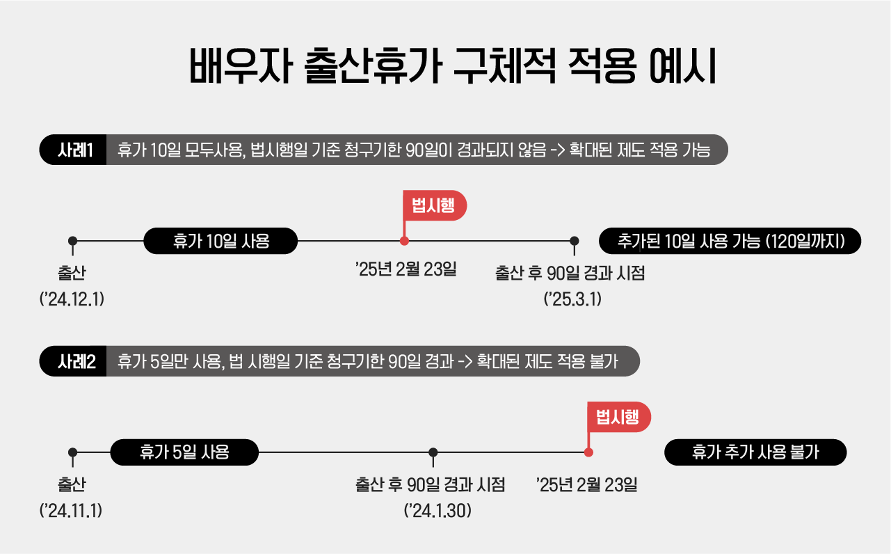 • (예시) 올해 11월 26일을 포함하여 그 이후 출산자는 늘어난 출산휴가 대상자가 됩니다. 내년부터는 출산휴가 사용가능 기간이 90일 이내가 아닌 120일 이내로 변경됩니다.