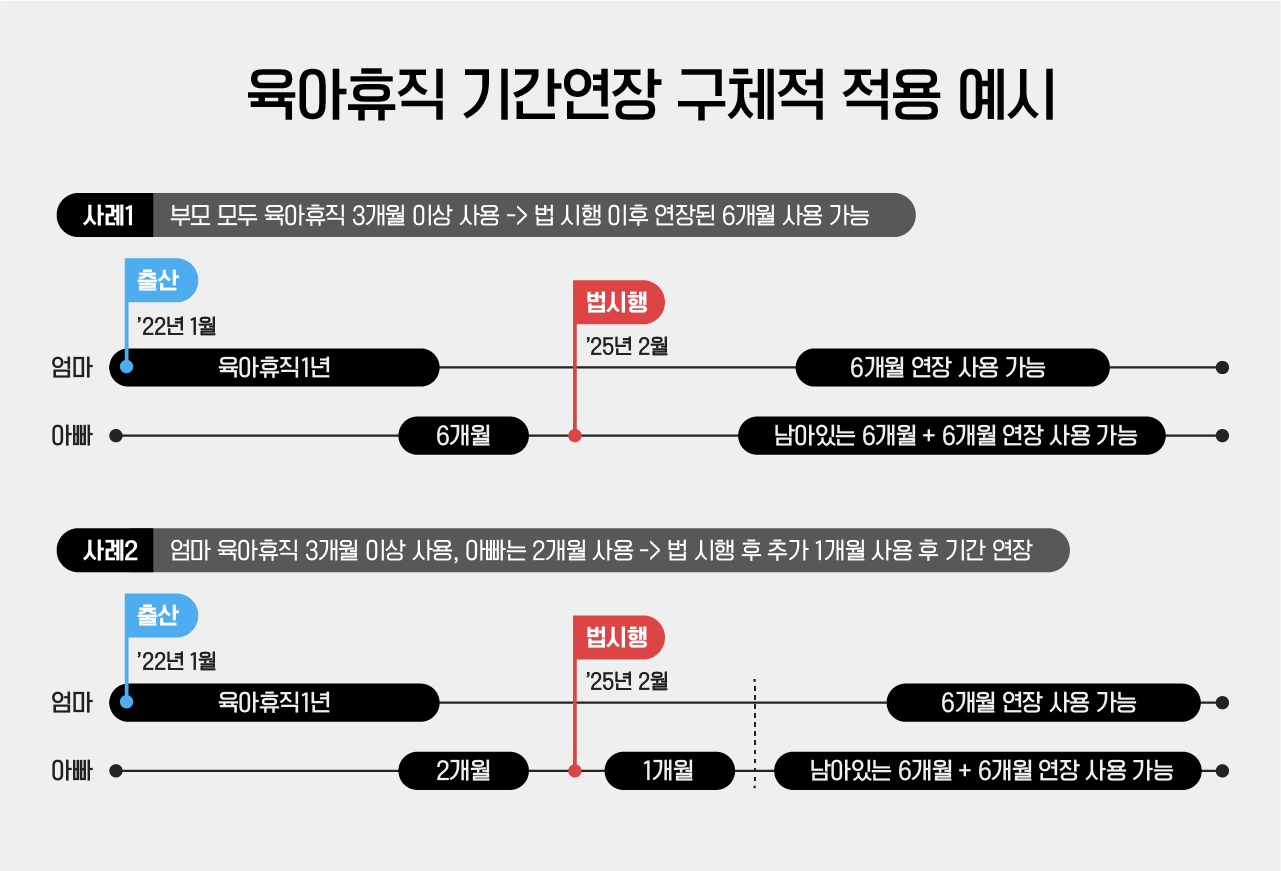 • (예시) 엄마가 육아휴직을 1년 사용했고, 아빠가 육아휴직을 2개월 사용했다면 아빠가 육아휴직을 1개월 더 쓴 다음에 엄마 육아휴직도 6개월 연장 가능