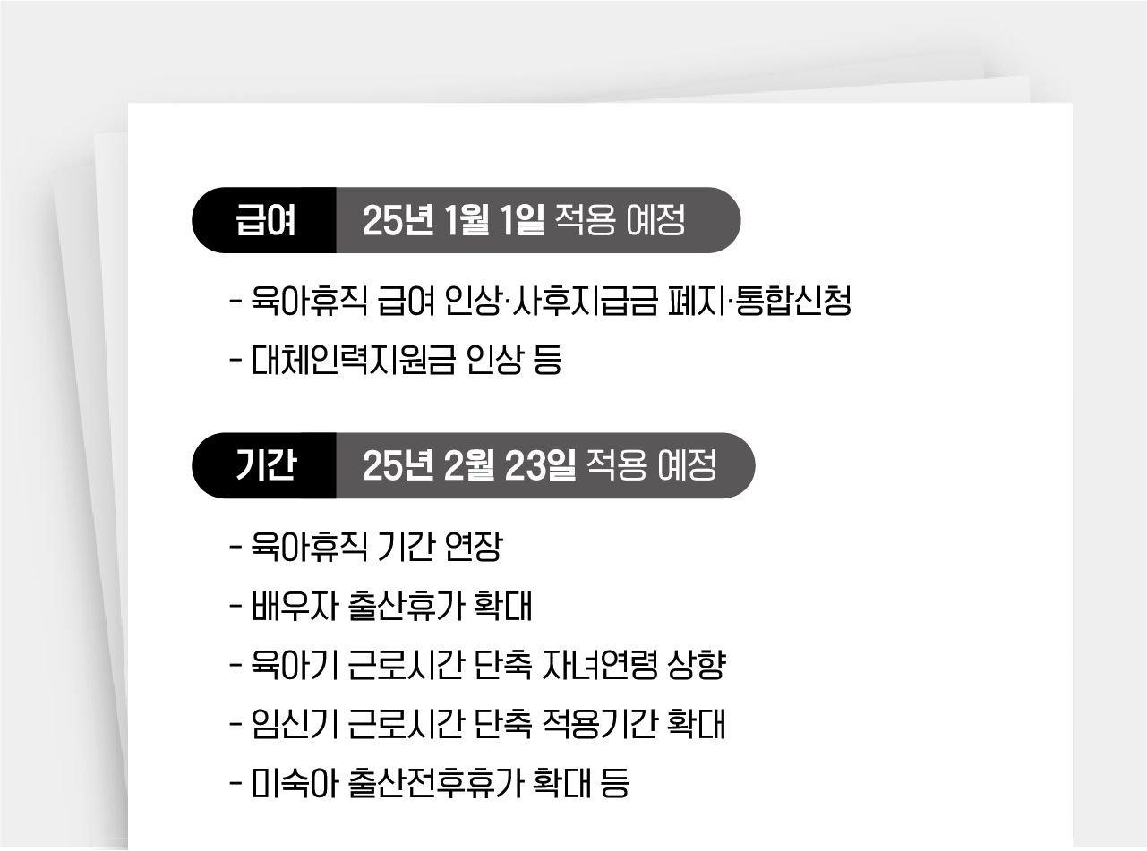 • '급여'관련 제도는 2025년 1월부터 적용되며, '기간'관련 제도는 2025년 2월 23일부터 적용됩니다.
