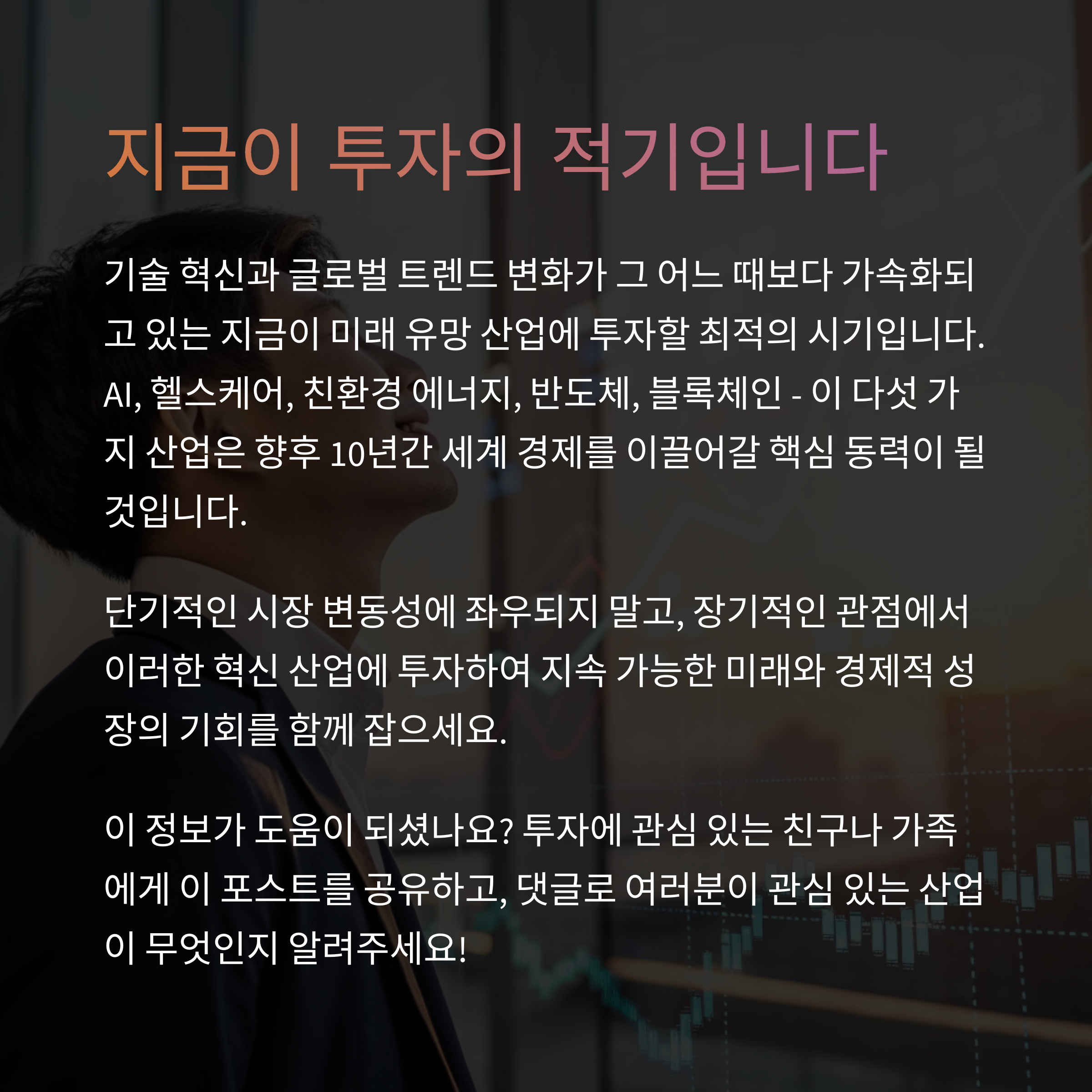 2025년은 단순한 전환점이 아닌 미래 경제의 주도권이 새롭게 재편되는 시기입니다. AI, 헬스케어, 친환경 에너지, 반도체, 블록체인 산업은 향후 수십 년간 시장을 견인할 잠재력을 지니고 있습니다. 지금 이 시점에서의 투자는 단순한 수익 이상의 의미를 가지며 미래에 대한 비전과 통찰을 실현하는 선택이 될 수 있습니다. 여러분만의 투자 원칙을 세우고, 장기적인 관점에서 이 유망 산업들과 함께 꾸준한 성장의 여정을 함께 해보시길 바랍니다.