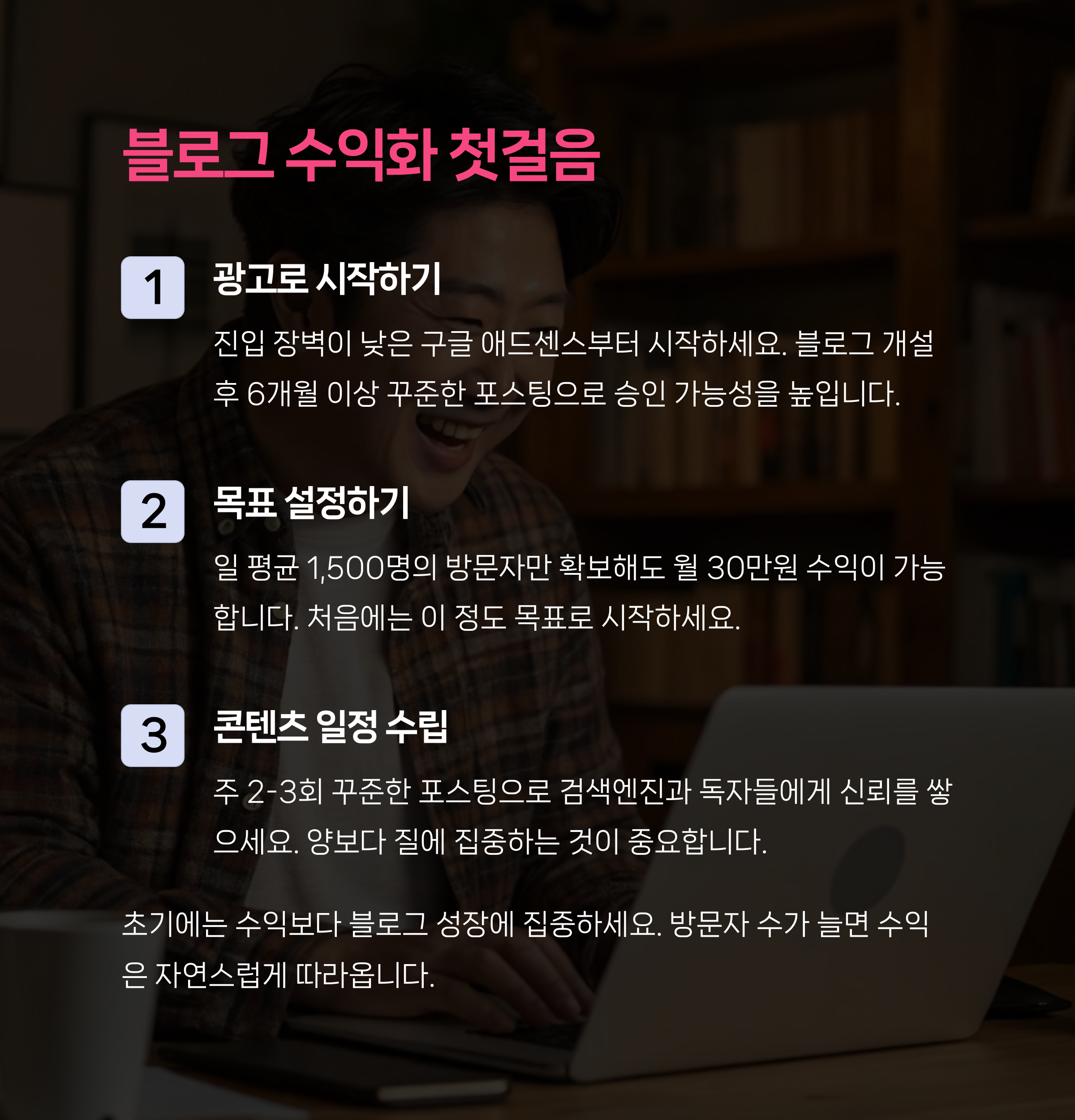 하루 1,000명 이상의 방문자가 유지되면 광고 수익만으로도 월 10만~30만 원 수익이 가능합니다.