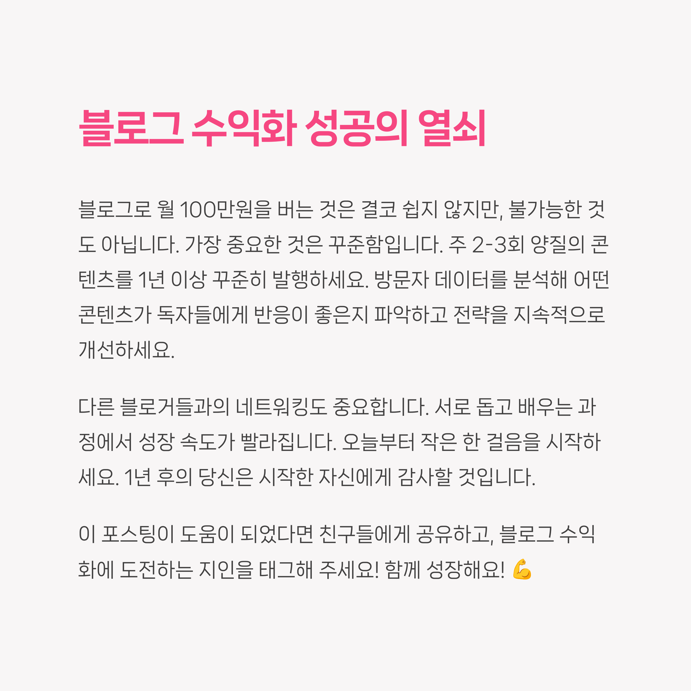 블로그 수익화는 단기적인 접근보다는 장기적인 전략과 꾸준한 실행이 중요한 여정입니다. 광고 수익으로 시작해 제휴 마케팅, 디지털 콘텐츠, 스폰서십으로 확장하는 것이 이상적입니다. 방문자 수를 높이고 독자의 신뢰를 얻는다면 월 100만 원 수익도 충분히 도달 가능합니다.