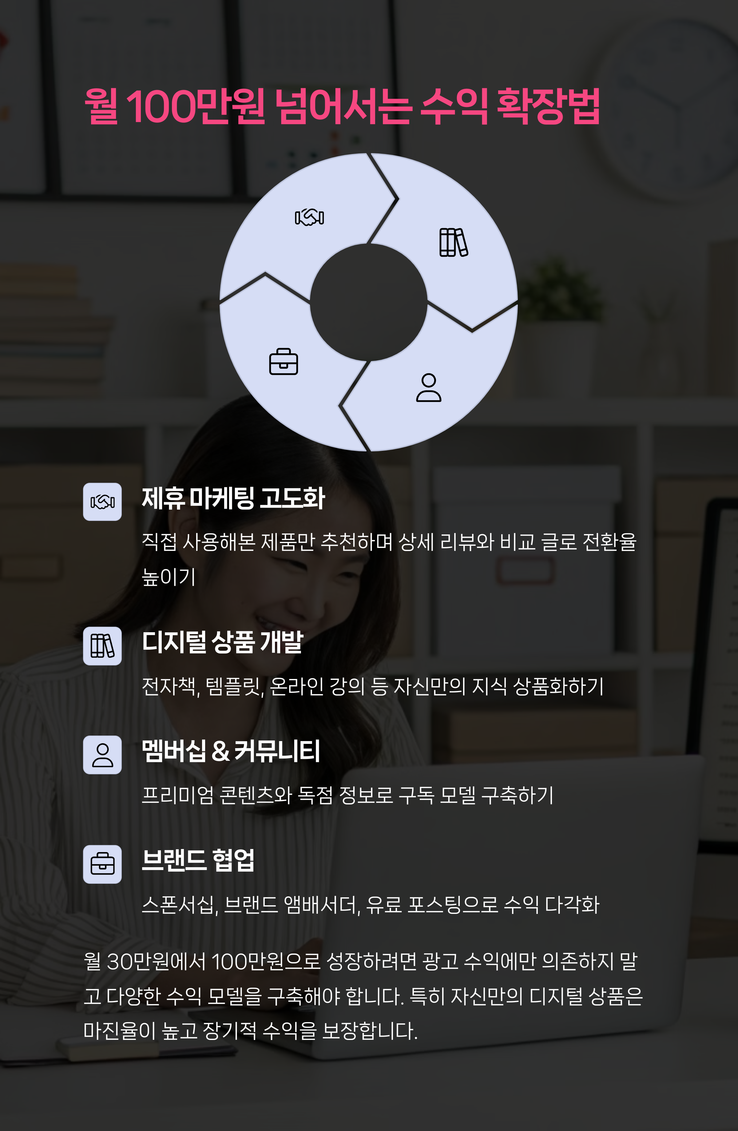 제휴 마케팅과 디지털 상품 판매는 수익의 폭을 크게 확장시킬 수 있는 방식입니다. 특히 제품 리뷰, 강의 제작, 전자책 판매 등은 방문자와의 신뢰가 쌓일수록 구매 전환율이 높아지기 때문에 장기적인 관점에서 매우 유리한 수익 모델입니다. 또한 기업과의 협업이나 스폰서 콘텐츠는 신뢰도와 영향력이 쌓인 후에 가능해지는 고수익 전략입니다.