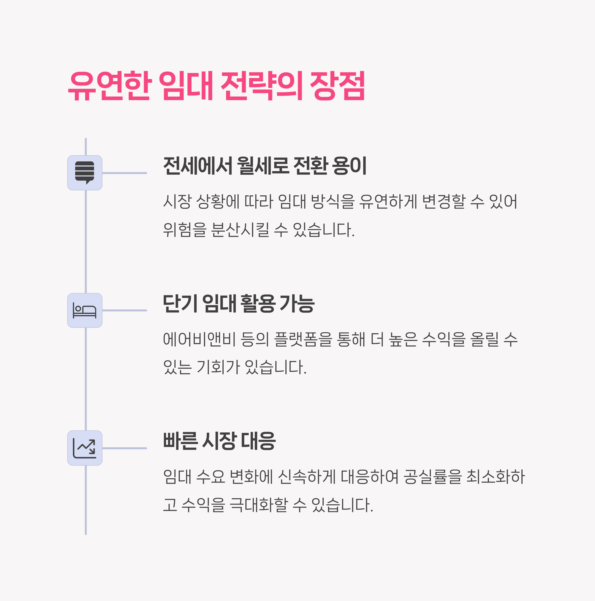 특히 소형 아파트는 임대 수익의 안정성과 운용 유연성 측면에서 타 부동산 자산보다 우위를 가집니다. 원룸, 오피스텔, 소형 평형 아파트 등은 대학생, 직장인, 신혼부부 등 고정 수요층이 있어 공실률이 낮고 회전율이 높습니다. 또한, 단기·장기 임대, 전세·월세 전환 등 다양한 임대 전략을 활용할 수 있어 시장 상황에 유연하게 대응할 수 있다는 장점이 있습니다.
