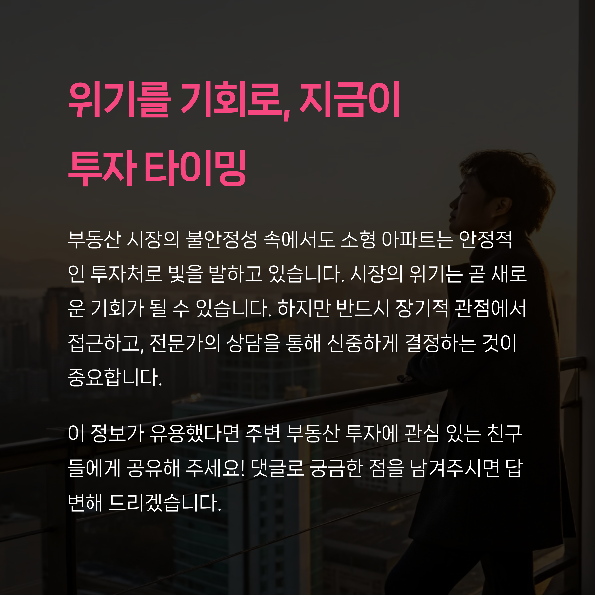 여러분은 소형 아파트 투자에 대해 어떻게 생각하시나요? 현재 시장 상황에서의 투자 전략이나 경험이 있다면 댓글로 자유롭게 공유해주세요!