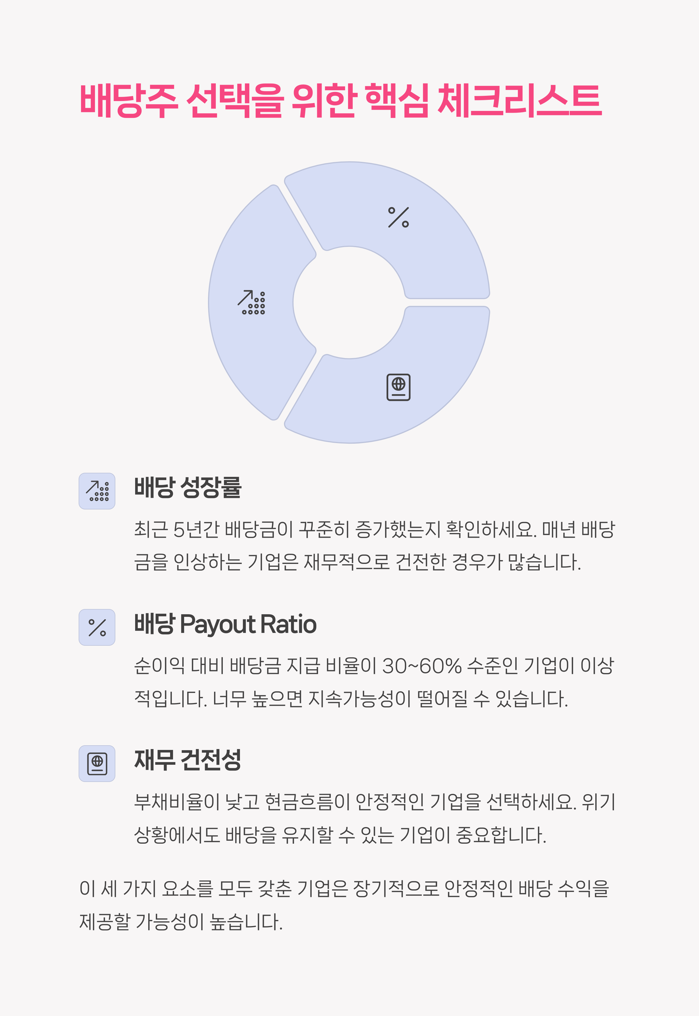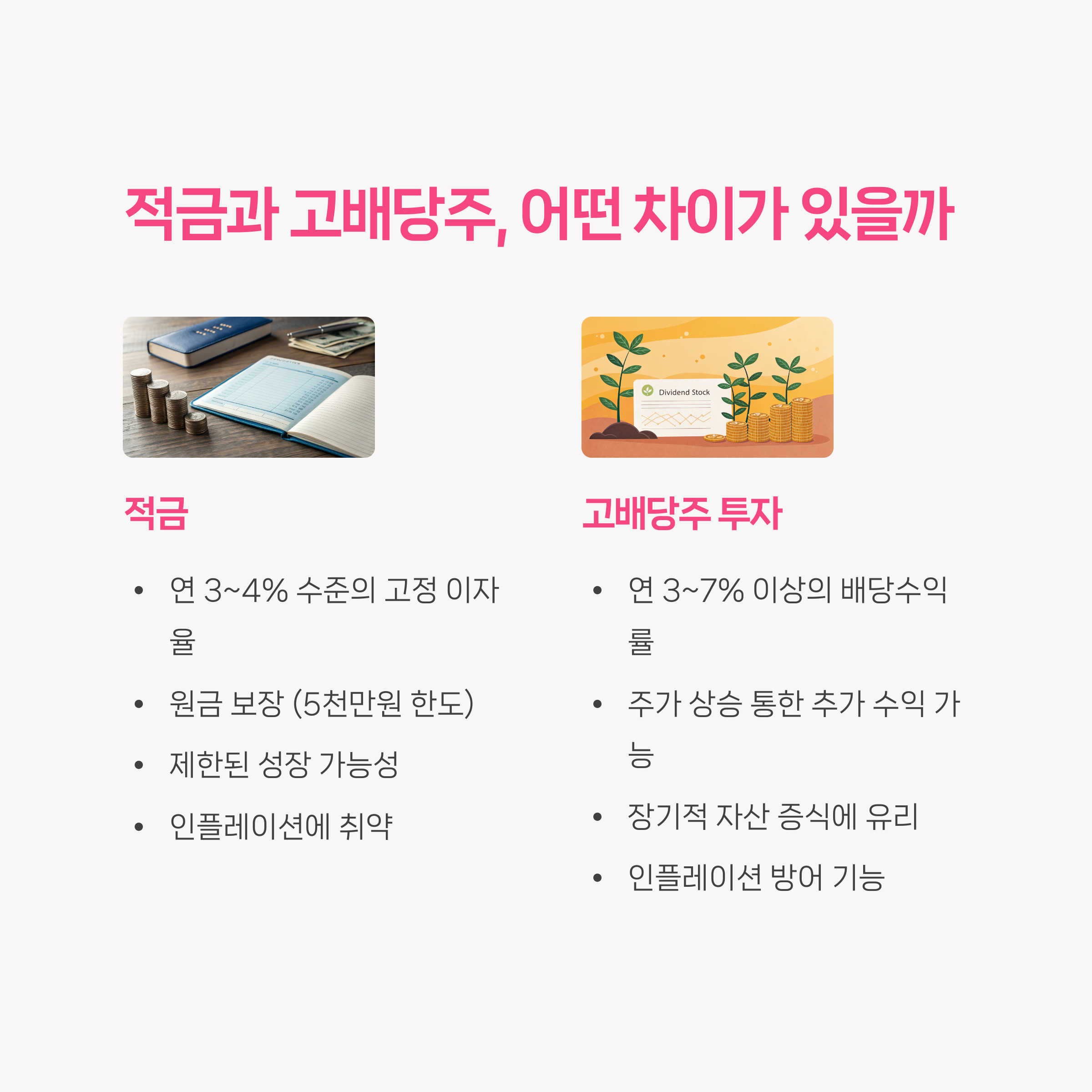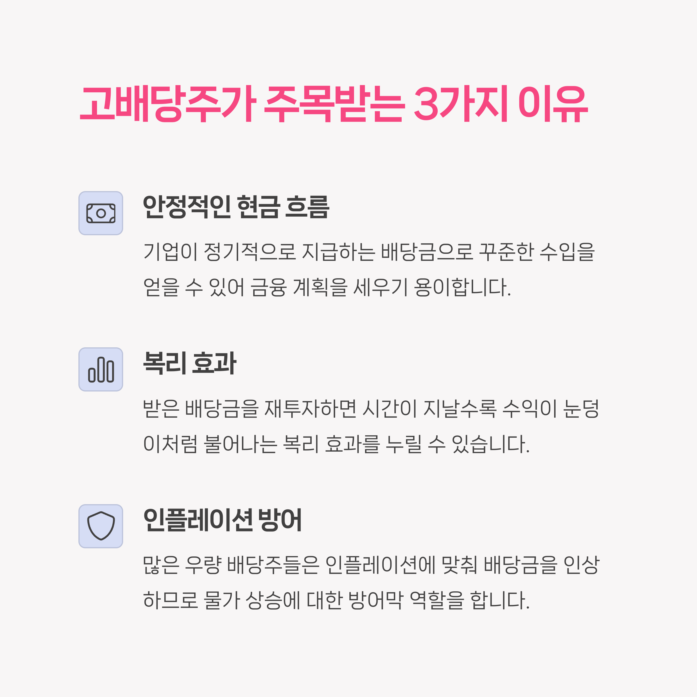 | 고배당주 장점 | 안정적인 배당금으로 예측 가능한 수익 확보 가능 |