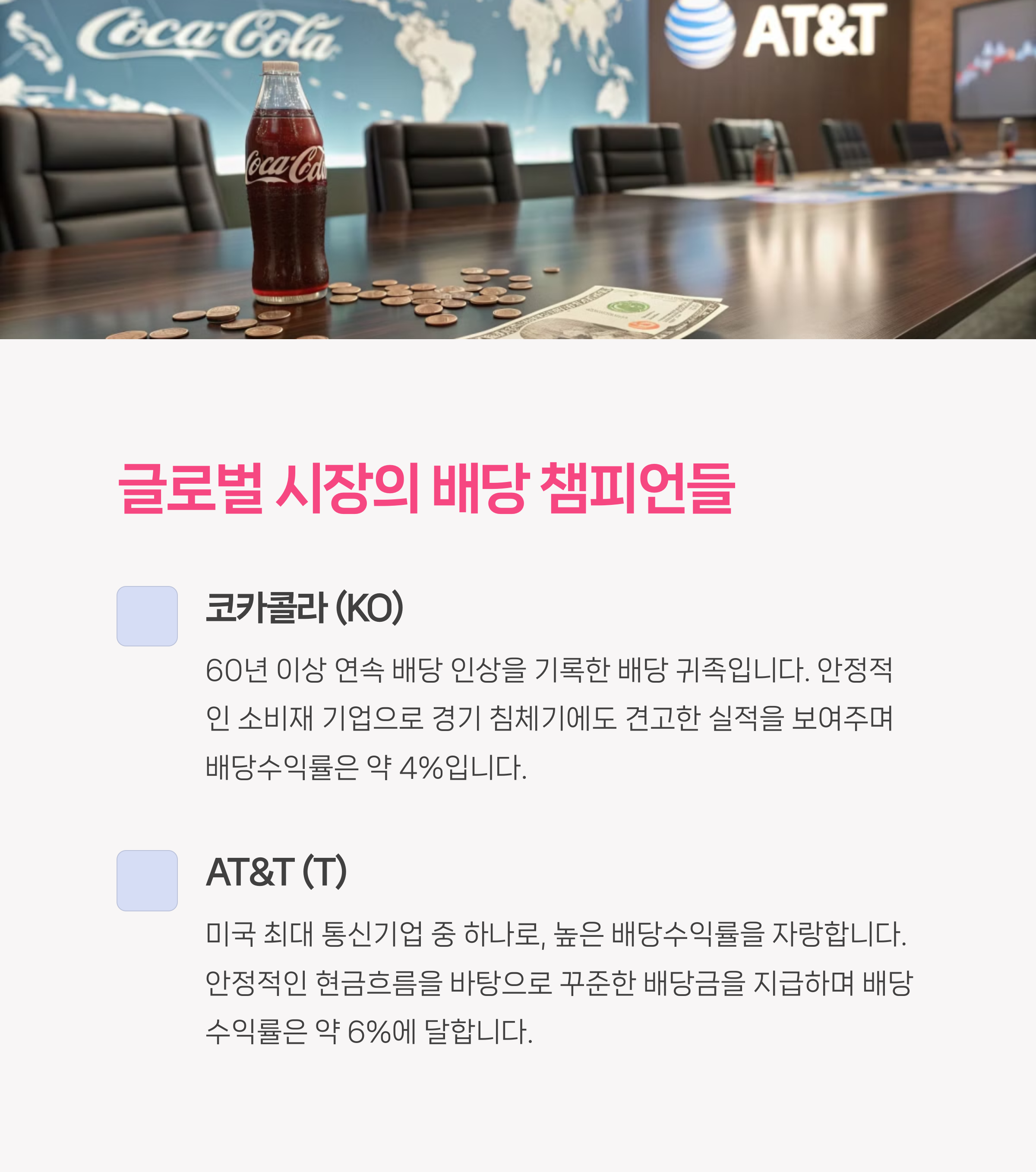 | 코카콜라 | 3.9% | 60년 연속 배당 |