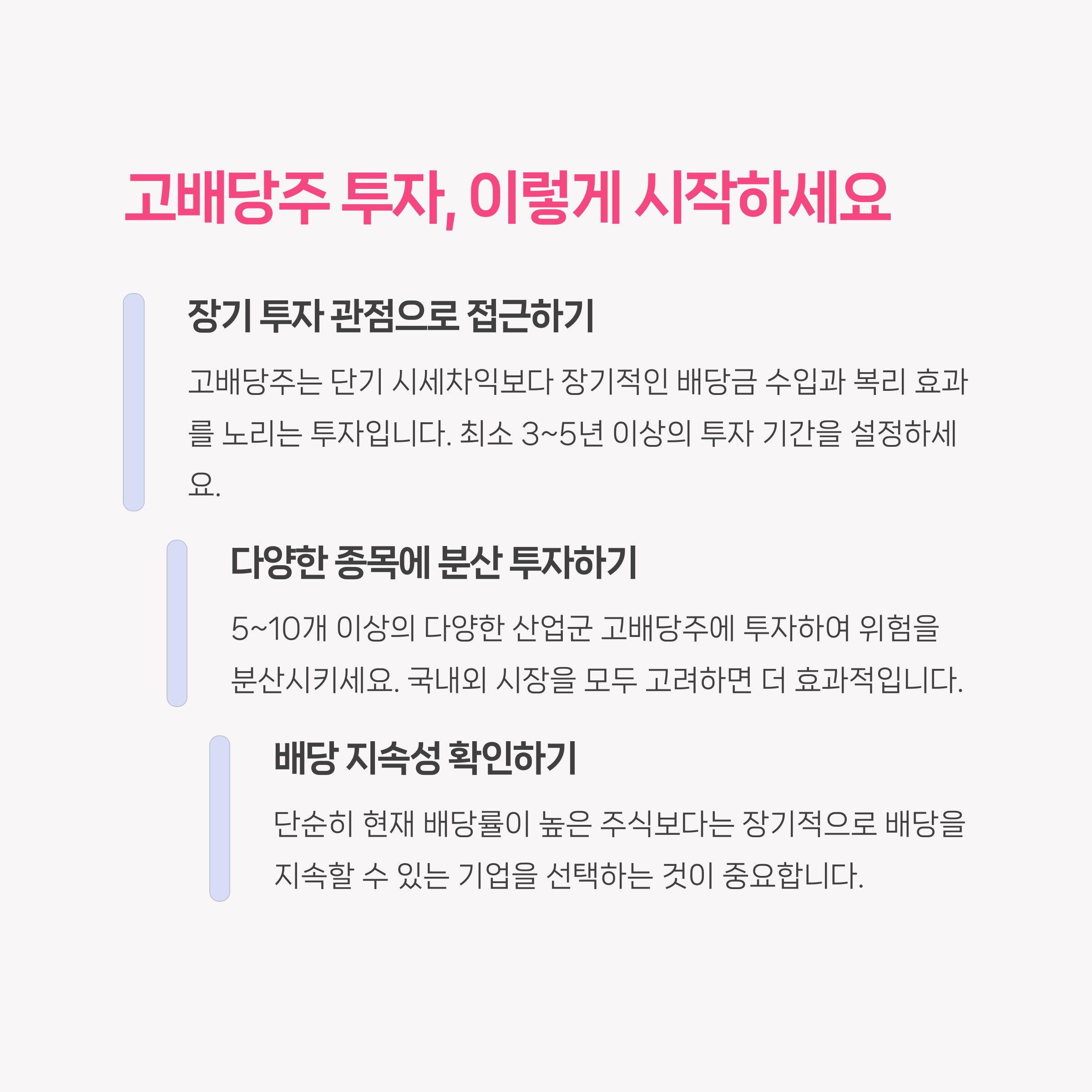 고배당주는 단기 시세차익보다는 배당금 수익과 복리 재투자 효과를 극대화하기 위한 장기 보유가 중요합니다. 특히 산업군 분산과 기업의 배당 지속 가능성, 실적 안정성 등을 고려해 탄탄한 배당 포트폴리오를 구축해보세요.