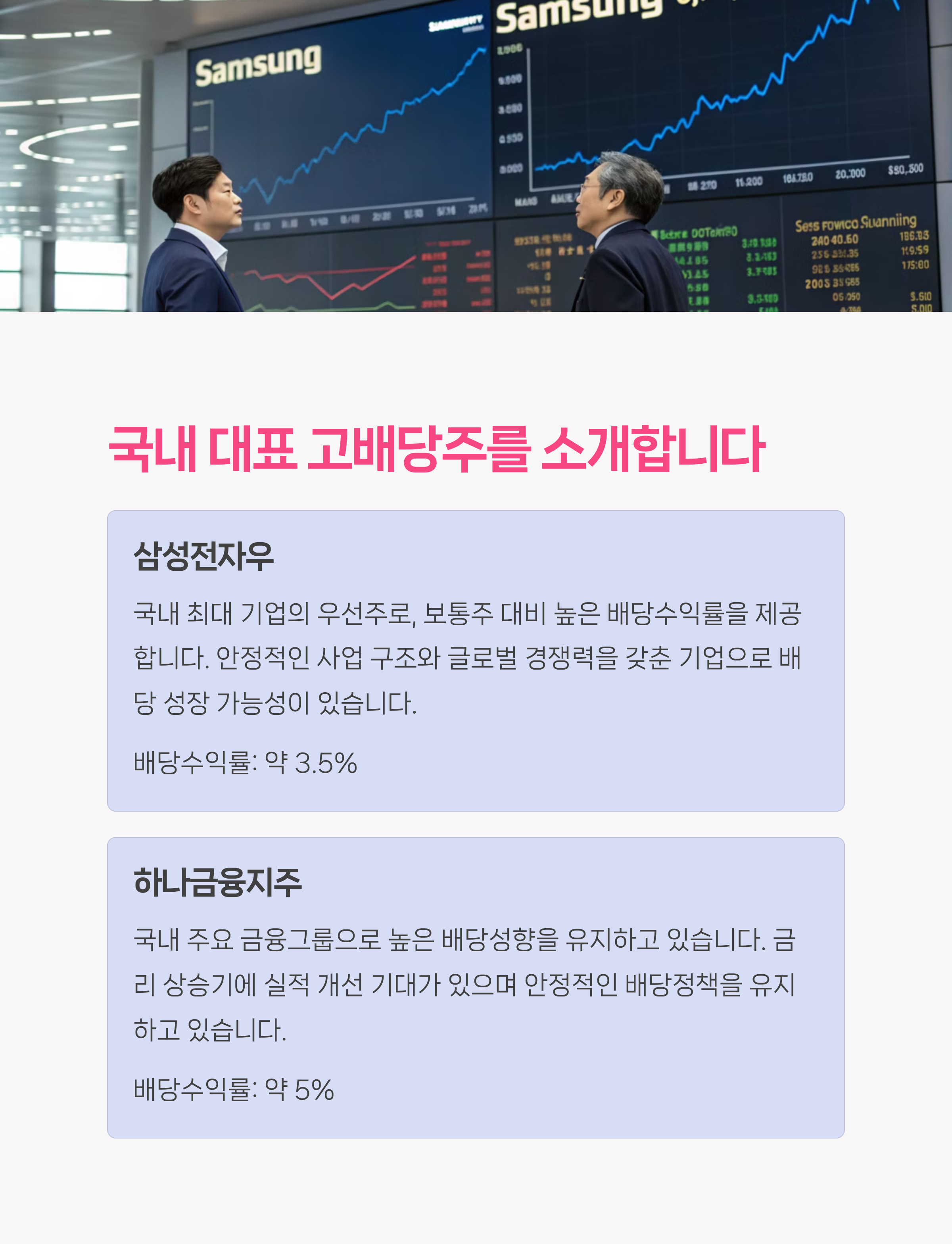 고배당주는 일반 주식과 달리 정기적으로 배당금을 지급하기 때문에 예측 가능한 현금 흐름을 원하는 투자자에게 적합합니다. 특히 고금리 시대에는 채권보다도 매력적인 수익률을 제공하며, 시장 변동성에 강한 방어적인 성격도 갖고 있어 중장기 투자 포트폴리오의 핵심으로 추천됩니다.