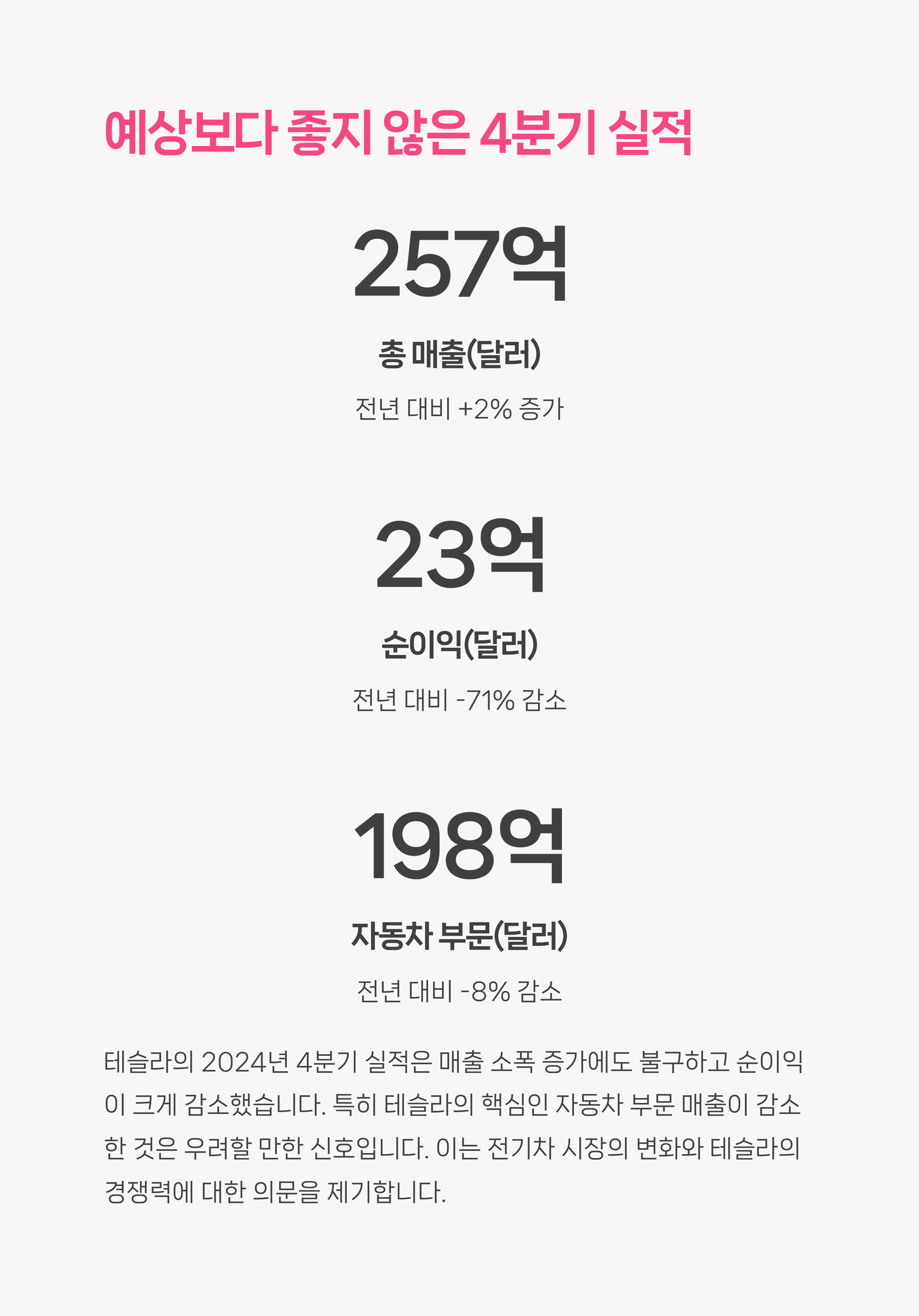 | 테슬라 실적 | 2024년 4분기 실적은 기대에 못 미쳤습니다. |