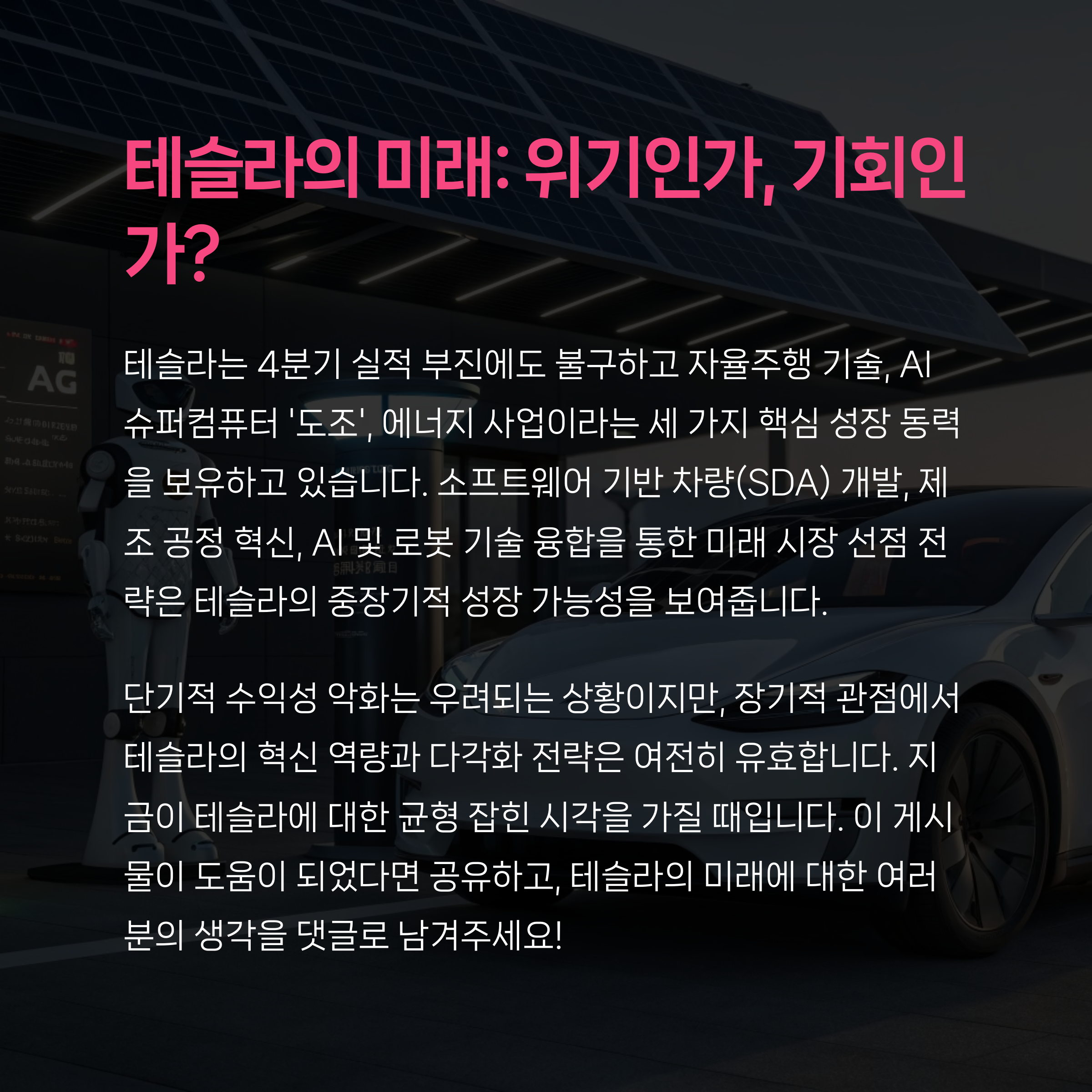 오늘 포스팅에 대한 의견이나, 테슬라 투자에 대한 여러분의 생각을 댓글로 남겨주세요. 서로의 인사이트를 나누며 더 나은 투자 방향을 함께 찾아가요!