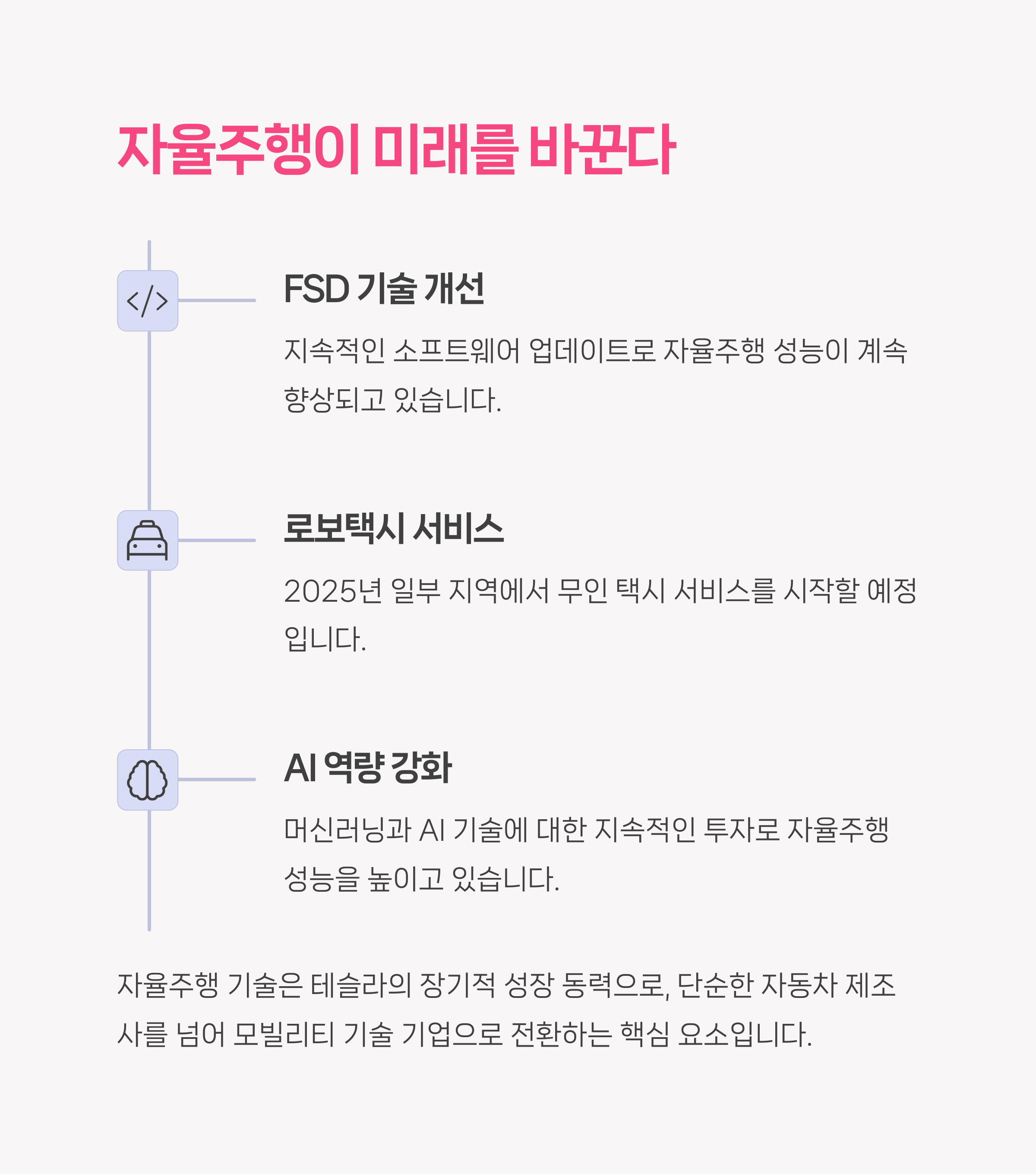 자율주행 기술은 테슬라의 미래 가치를 결정짓는 핵심 요소입니다. 기술 진보에 따라 수익 모델과 기업 가치가 크게 확대될 수 있습니다.