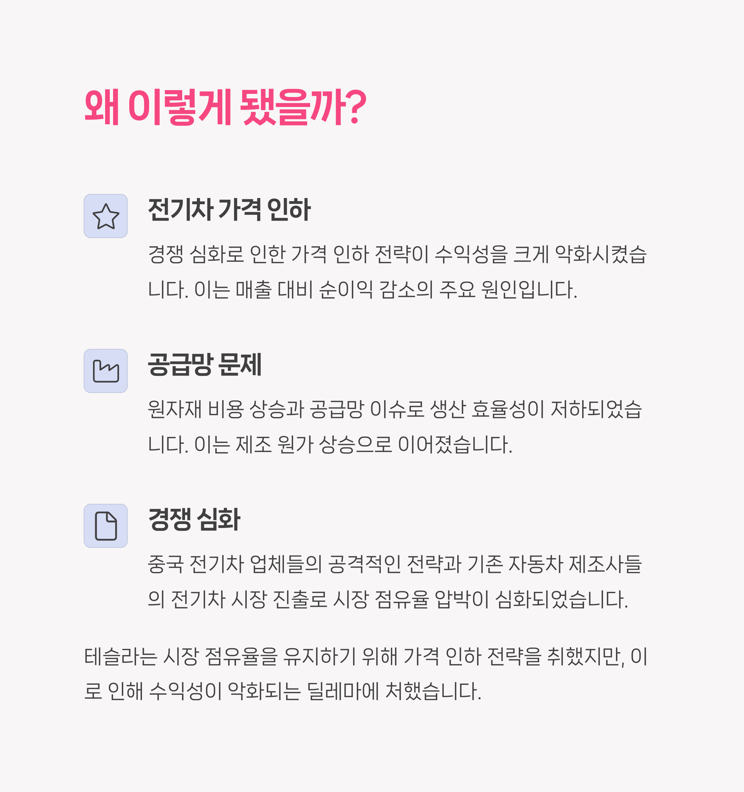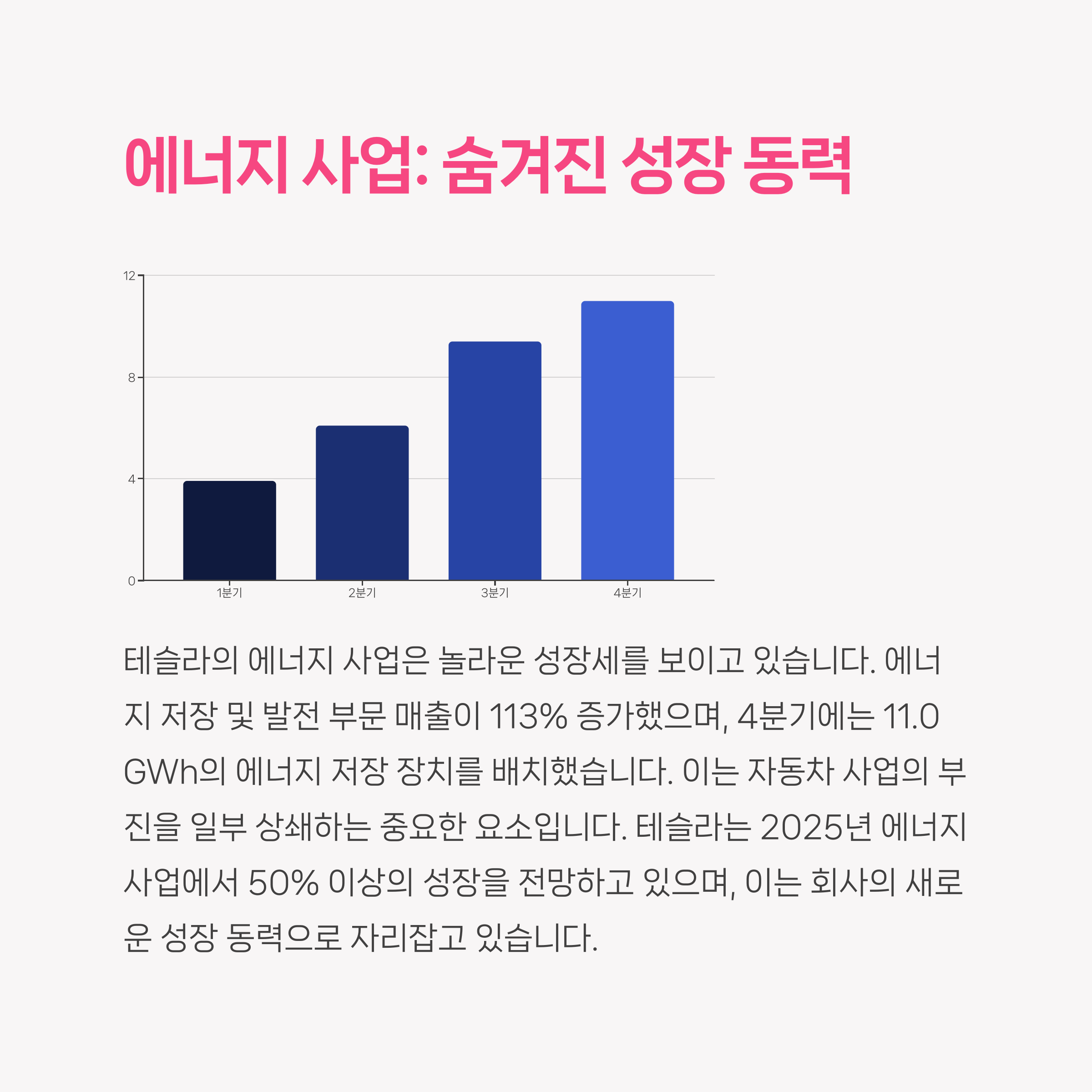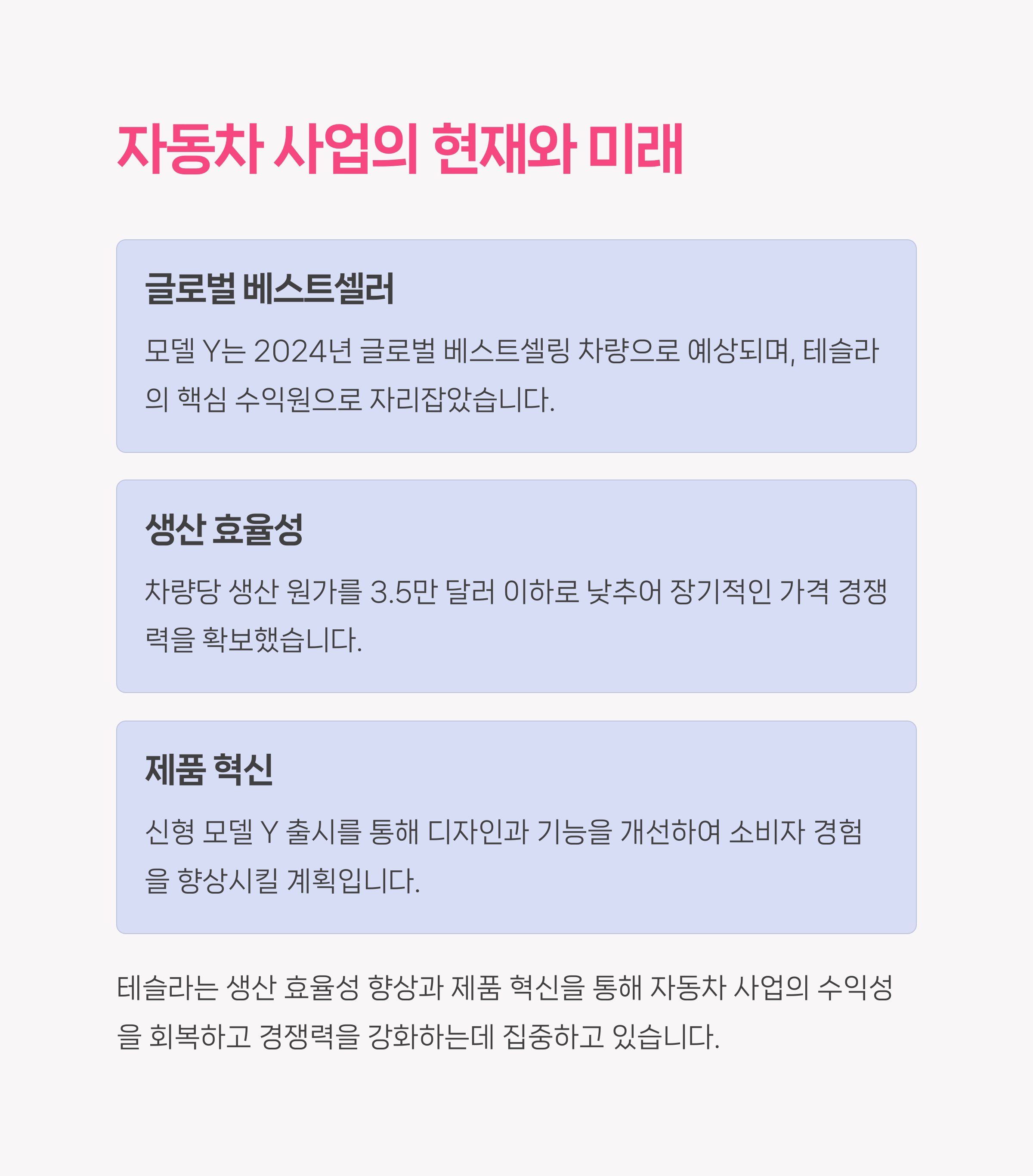 | 매출 증가에도 순이익 감소 | 도조 슈퍼컴퓨터, FSD 베타 확대 | 단기/장기 전략 구분 필요 |