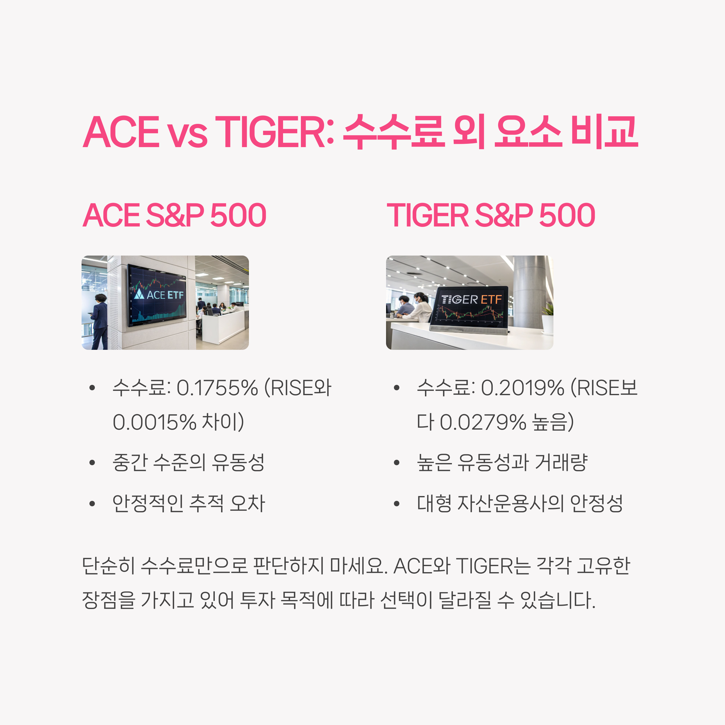 2025년 2월 기준, 수수료가 가장 낮은 ETF는 RISE 미국S&P500 (0.1740%)이며, 그 뒤를 ACE(0.1755%)와 TIGER(0.2019%)가 잇고 있습니다. 반면, PLUS(0.6883%)와 HANARO(0.6636%)는 상대적으로 높은 수수료를 유지 중입니다. 실질적으로는 수수료 외에 거래비용까지 포함한 실부담비용률을 비교하는 것이 중요합니다.