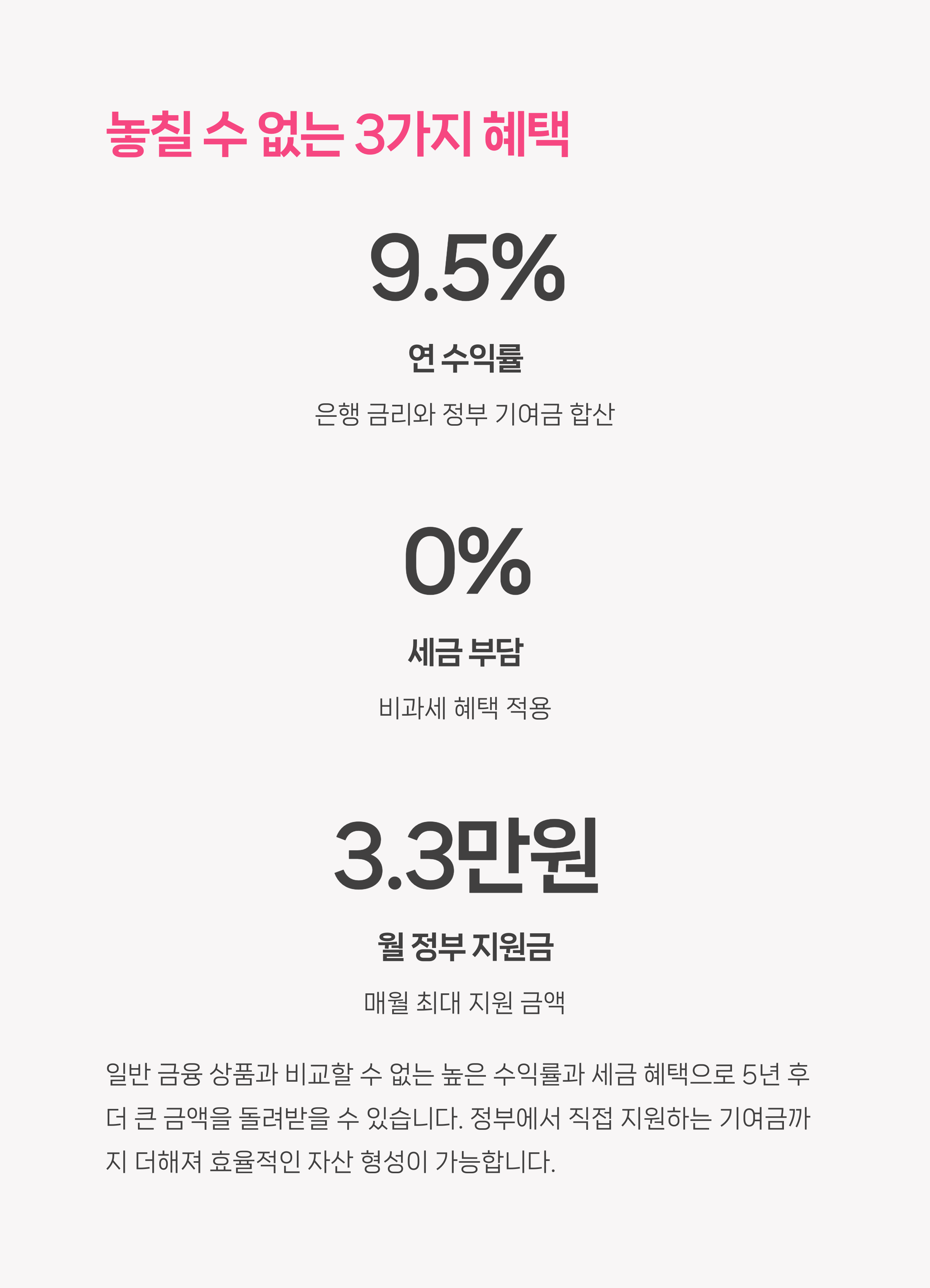 최대 수익률 연 9.5%로 높은 수익률과 정부 기여금 제공