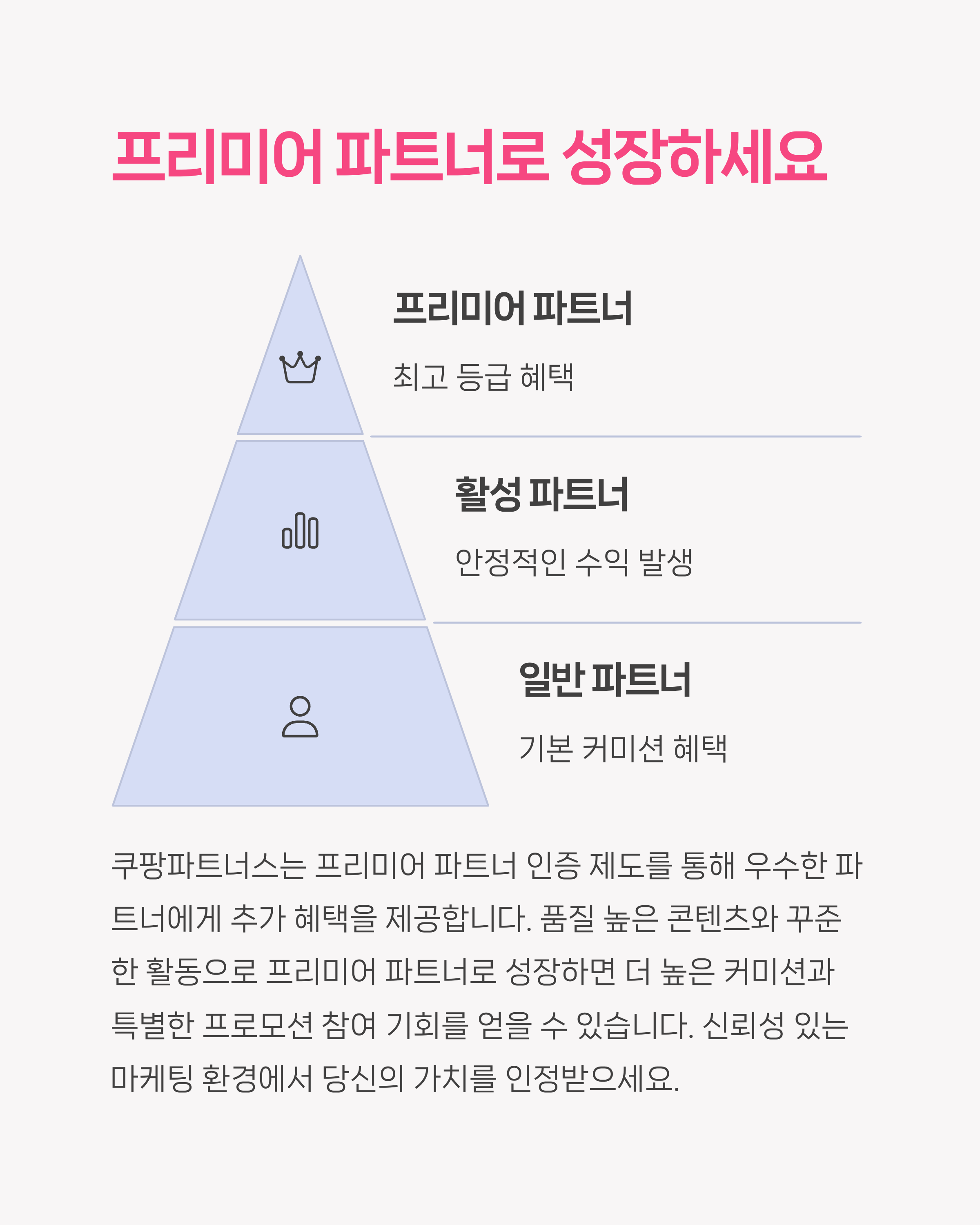 | 일부 상품은 기본보다 높은 커미션 제공 | 쿠팡파트너스 페이지에서 간편하게 링크 생성 | 프리미어 파트너 등급 획득 시 추가 혜택 기대 |