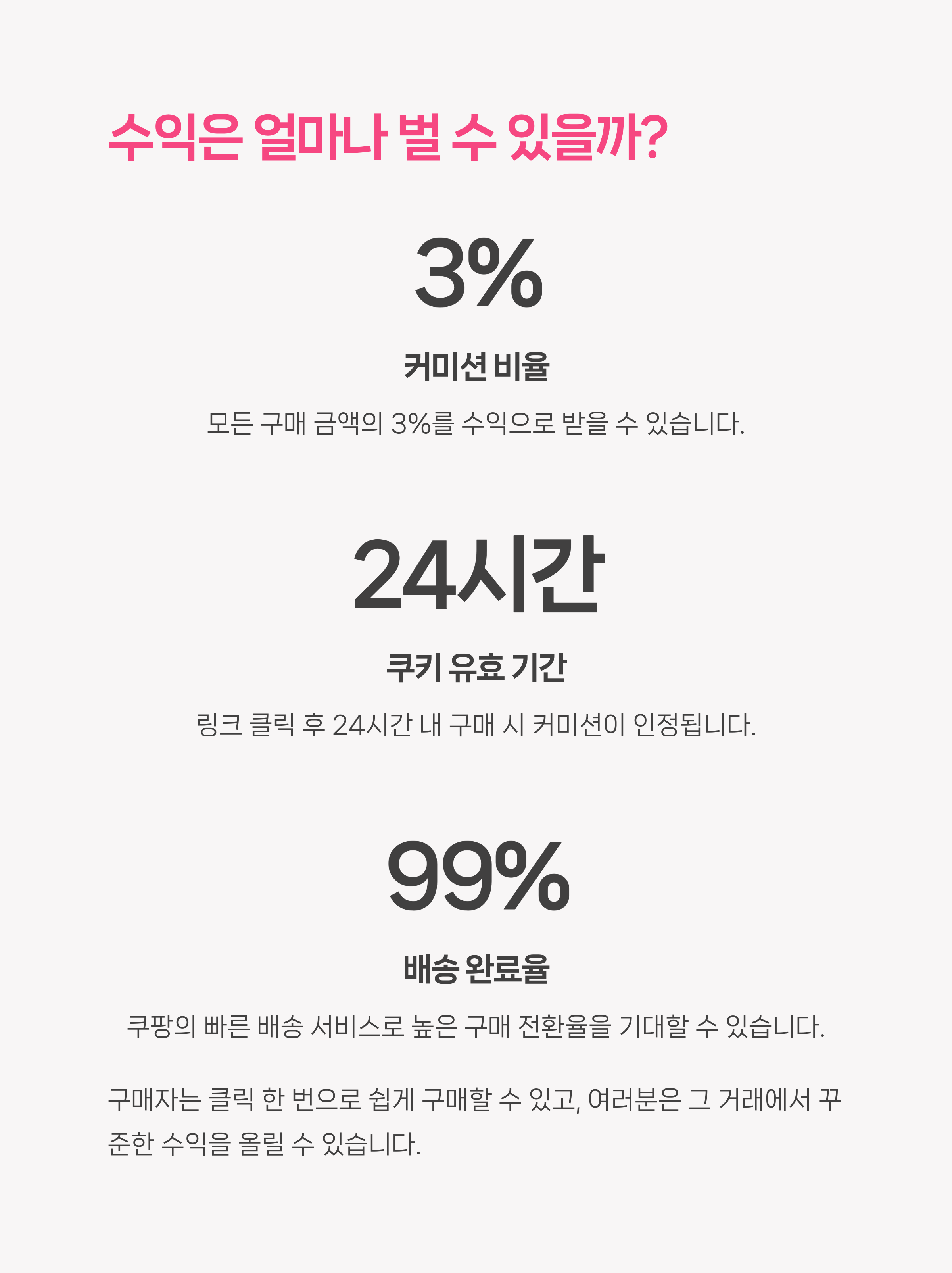| 수익 조건 | 링크 클릭 후 24시간 이내 구매 시 수익 발생 |
