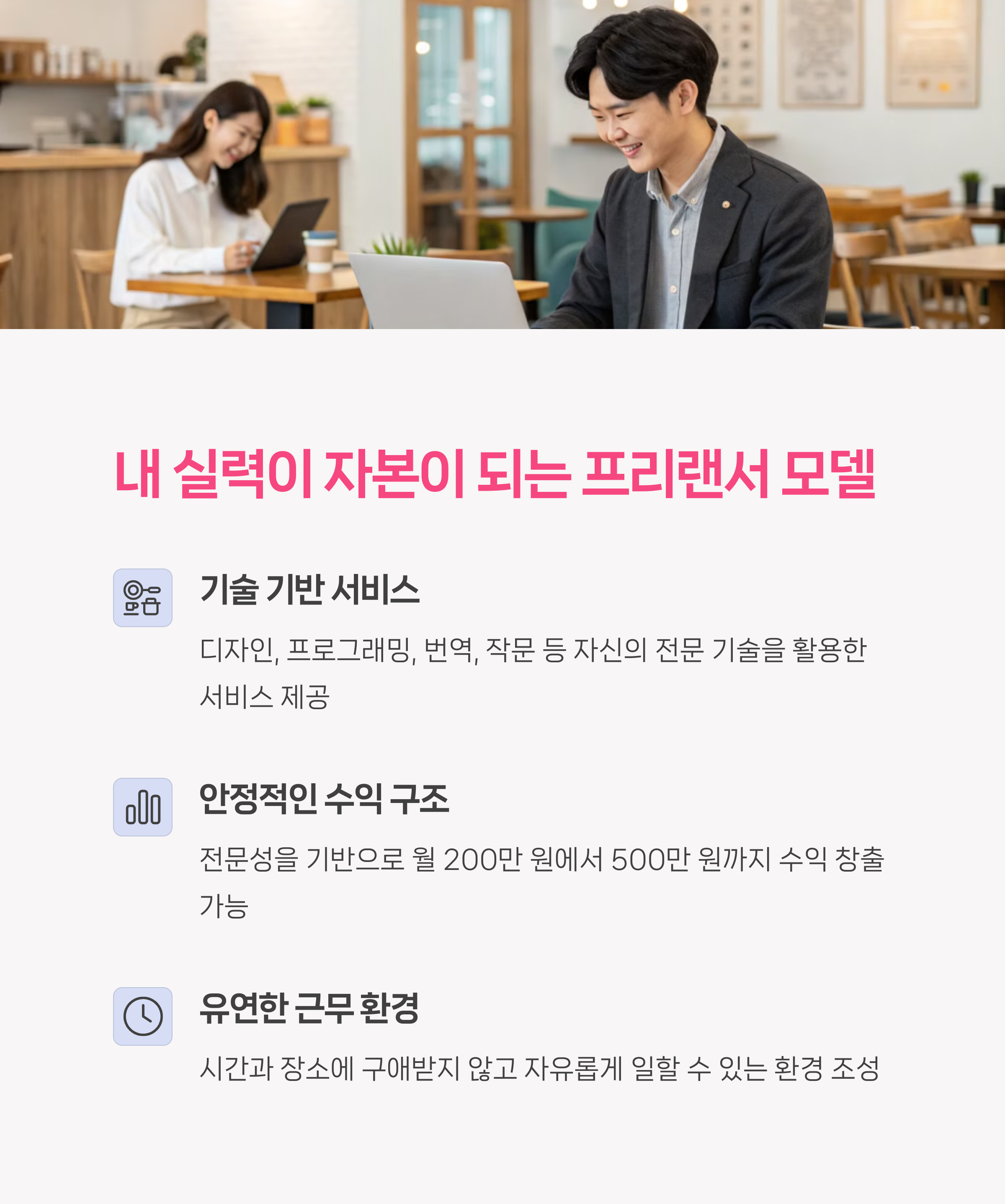 | 공간 대여로 월 50만~100만 원 수익 가능 | 광고·제휴·협찬 등으로 수익 다각화 가능 | 기술 기반으로 자유롭게 수익 창출 가능 |