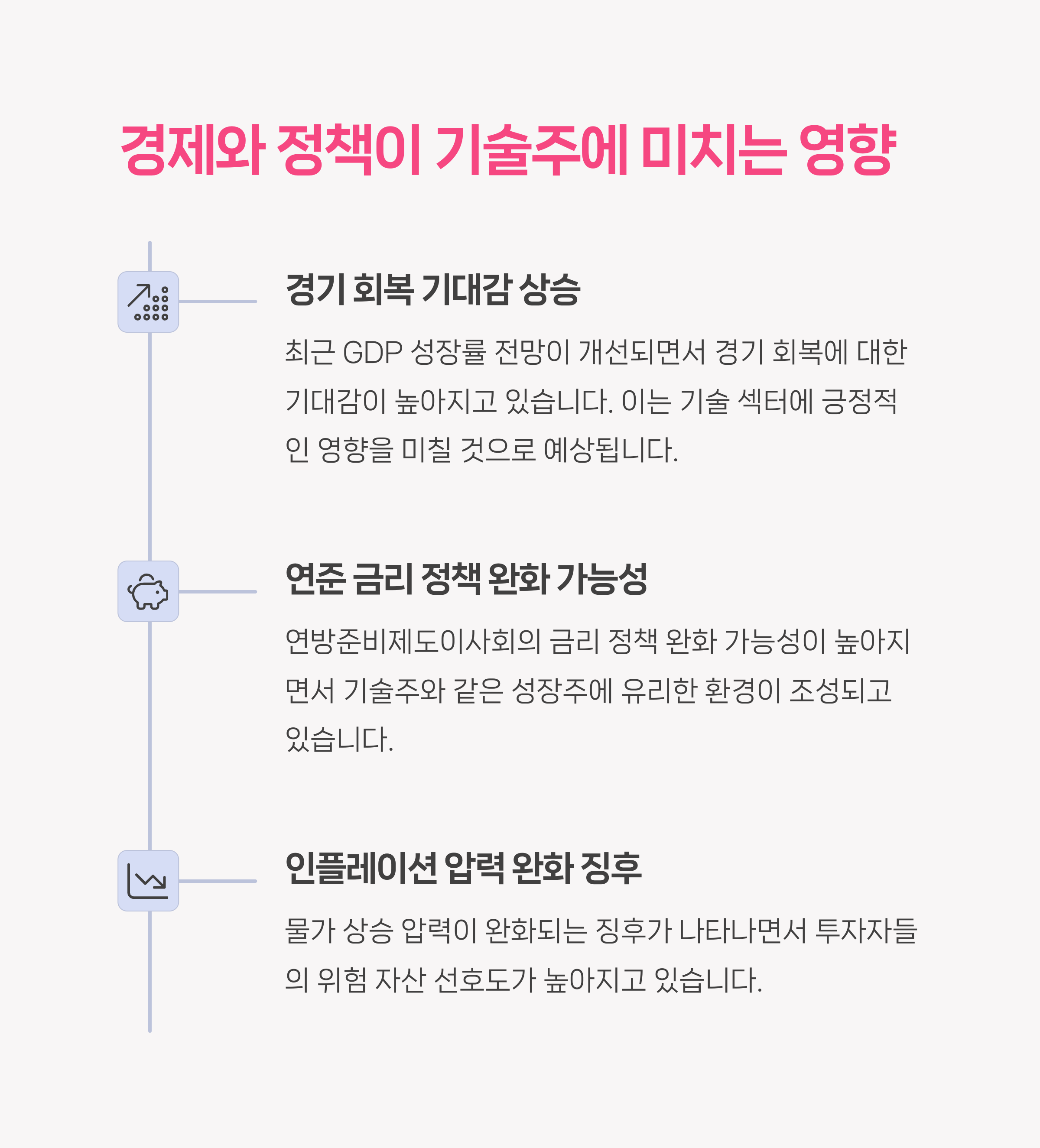 두 번째 신호는 경제적 및 정책적 환경입니다. 미국 연준의 금리 인상 사이클이 둔화되고, 인플레이션도 안정화되는 가운데 AI와 반도체 중심의 정부 지원 확대가 기술주에 호재로 작용하고 있습니다. 특히 경기 회복에 대한 기대가 커지며, 자금이 다시 성장주로 이동할 가능성이 제기되고 있습니다. 금리 하락 + 정책 지원의 투자 유인 조합은 기술주에 긍정적인 영향을 줄 수 있습니다.