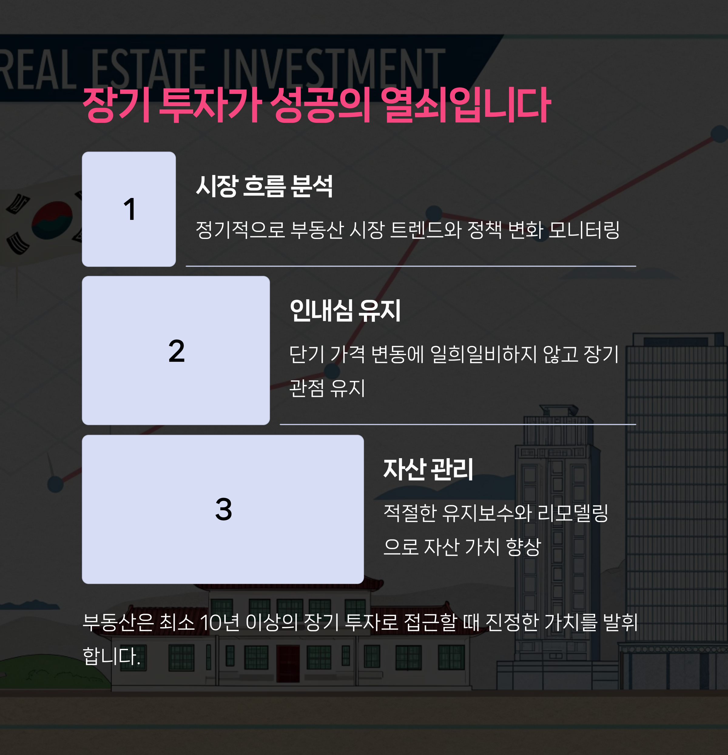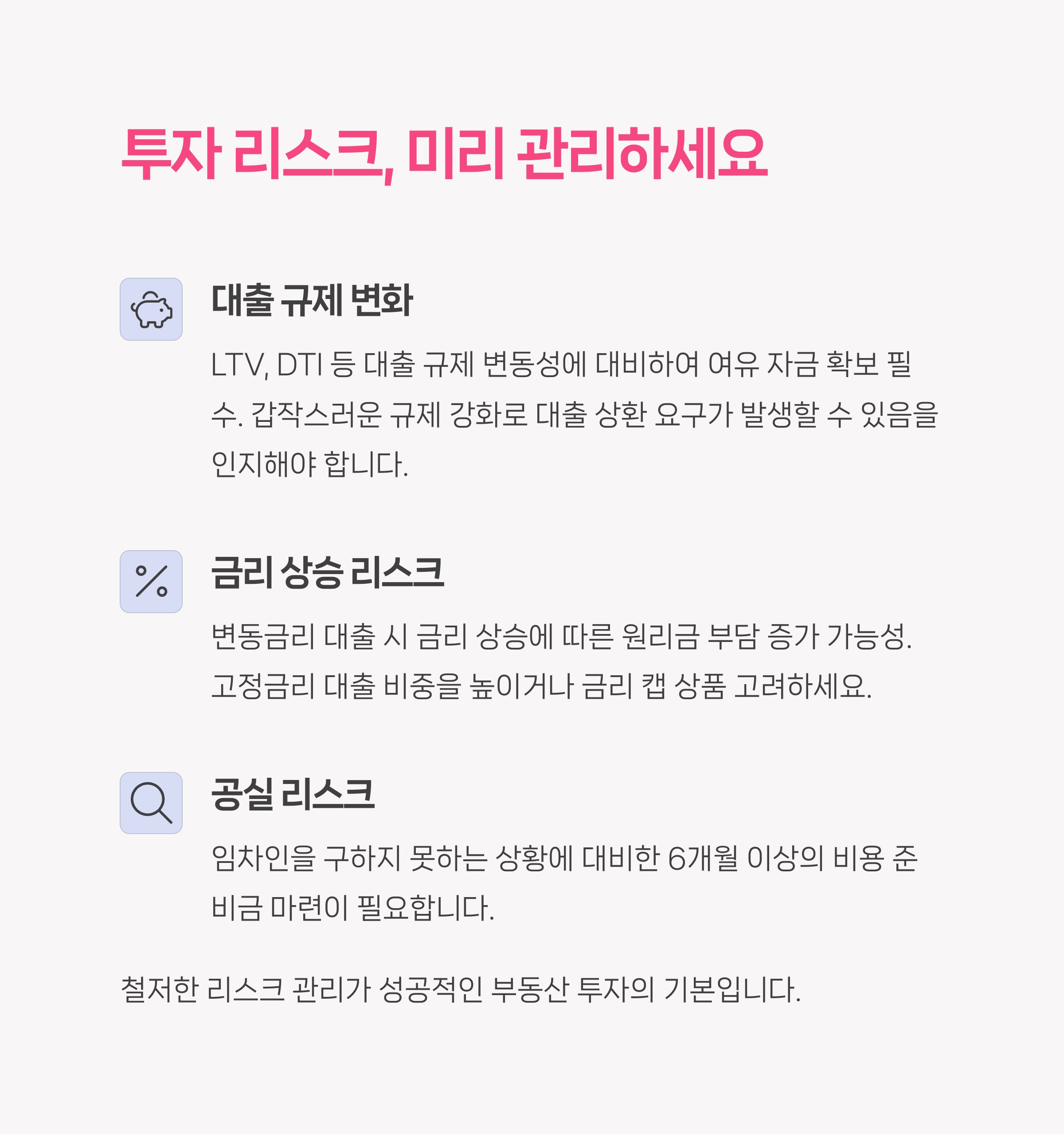 하락장일수록 리스크 관리가 더욱 중요합니다. 대출 규제가 강화되며 DSR 제한으로 인해 자기자본 비중을 높이는 전략이 필요합니다. 단기 시세 차익보다는 장기 보유를 전제로 접근하며, 처음엔 소액 갭투자나 구축 투자부터 시작해 안정성을 확보해야 합니다. 시장 흐름에 대한 꾸준한 학습과 정보 탐색은 성공 확률을 높이는 열쇠입니다.