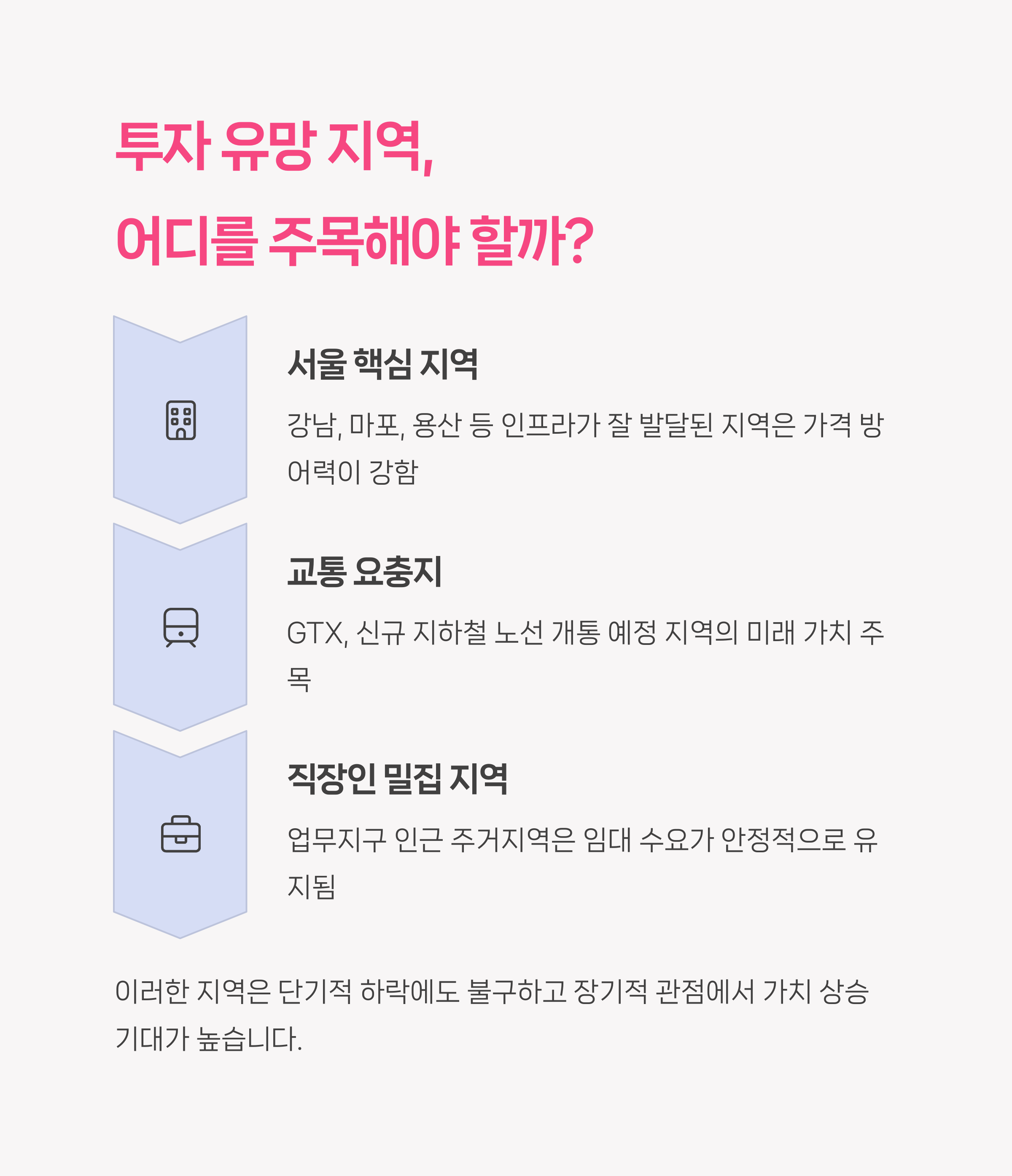 하락장일수록 좋은 입지에 집중해야 합니다. 서울 강남, 서초, 송파처럼 프리미엄이 유지되는 지역이나 GTX, 신도시 개발이 예정된 지역은 장기적으로 회복 가능성이 큽니다. 특히 직주근접 수요가 몰리는 광교, 판교, 마곡 등은 전세 수요도 높아 공실 리스크가 낮고, 임대 수익형 투자에도 적합합니다. 교통, 직장 접근성, 생활 인프라를 중심으로 선별 투자하는 것이 핵심입니다.
