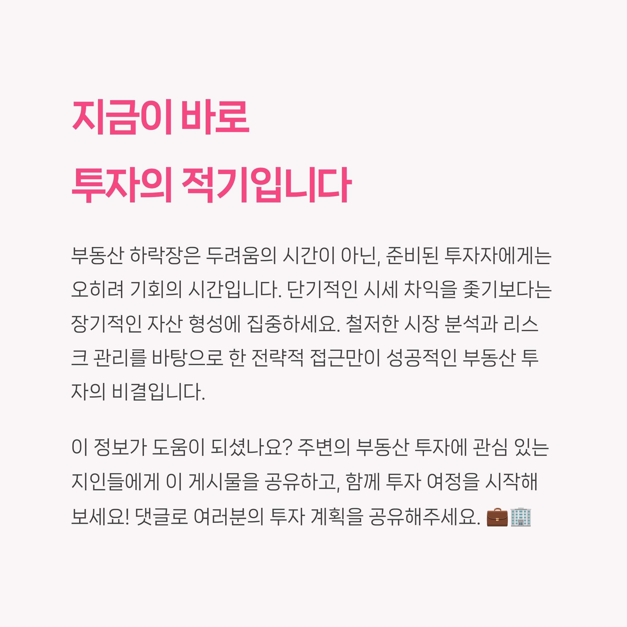 부동산 시장에 대해 궁금했던 점이나 경험하신 투자 전략을 댓글로 공유해주세요. 함께 정보를 나누며 더 나은 판단을 만들어가요!
