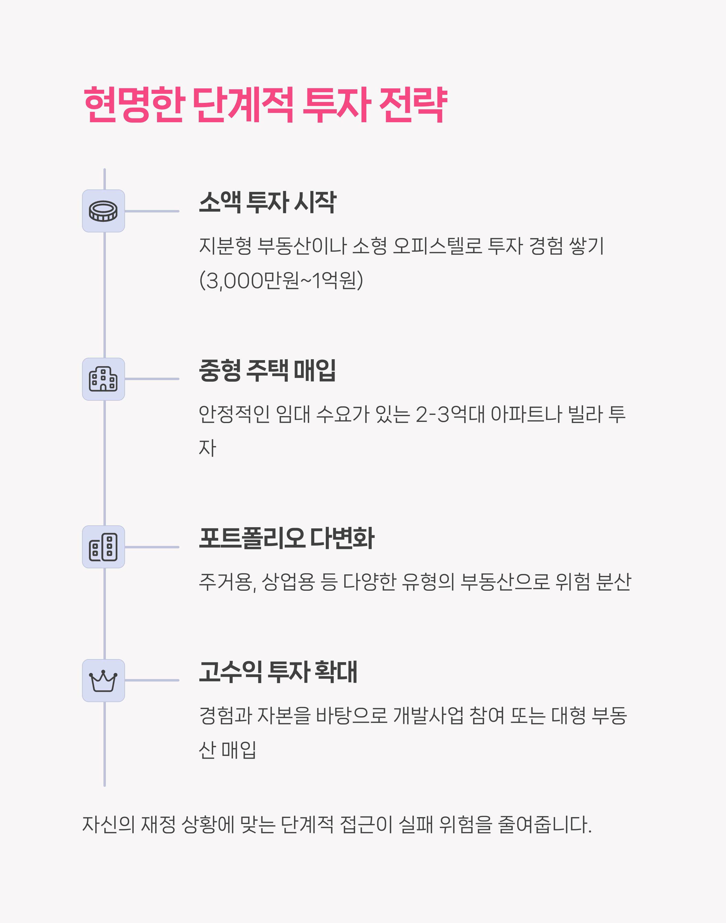 하락장일수록 리스크 관리가 더욱 중요합니다. 대출 규제가 강화되며 DSR 제한으로 인해 자기자본 비중을 높이는 전략이 필요합니다. 단기 시세 차익보다는 장기 보유를 전제로 접근하며, 처음엔 소액 갭투자나 구축 투자부터 시작해 안정성을 확보해야 합니다. 시장 흐름에 대한 꾸준한 학습과 정보 탐색은 성공 확률을 높이는 열쇠입니다.