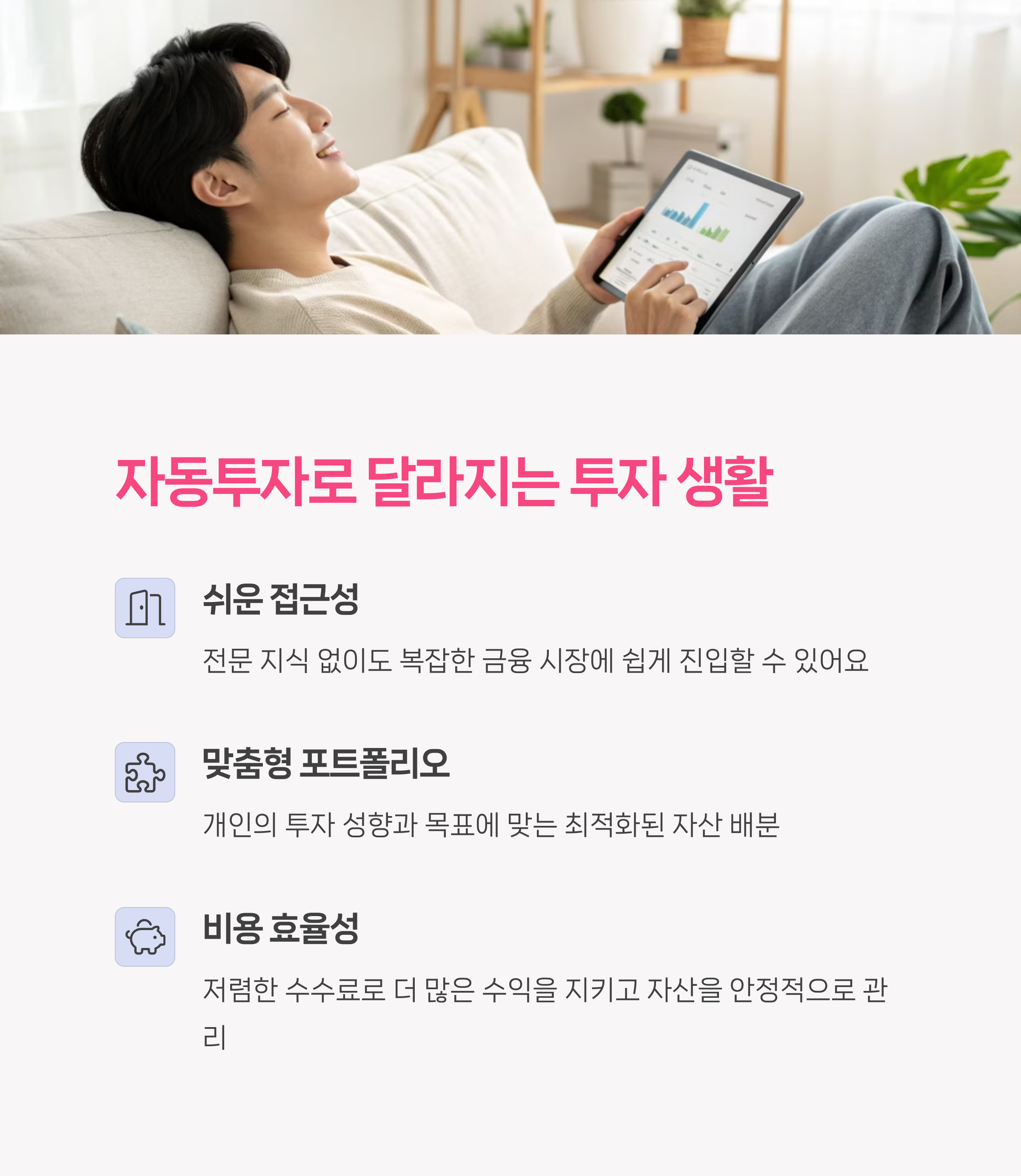 초보자 장점 | 금융 지식 없이도 자산 배분, 분산 투자, 리밸런싱을 자동으로 실행 |