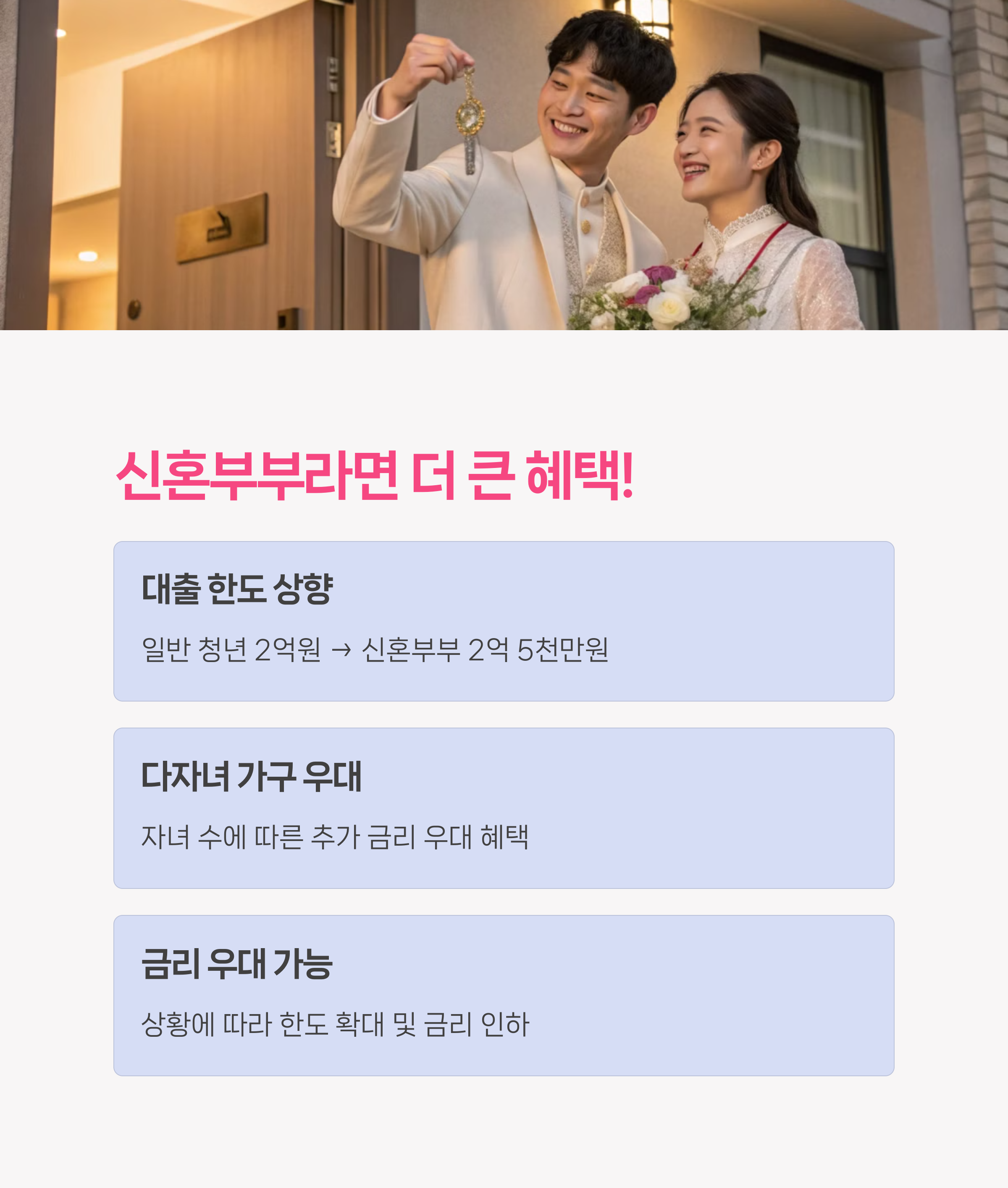 | 자산 3.37억 원 이하 기준 충족 필요 | 신혼부부는 특별우대 조건 적용 가능 | 기본 금리는 연 2.0~3.1%로 조정됨 |