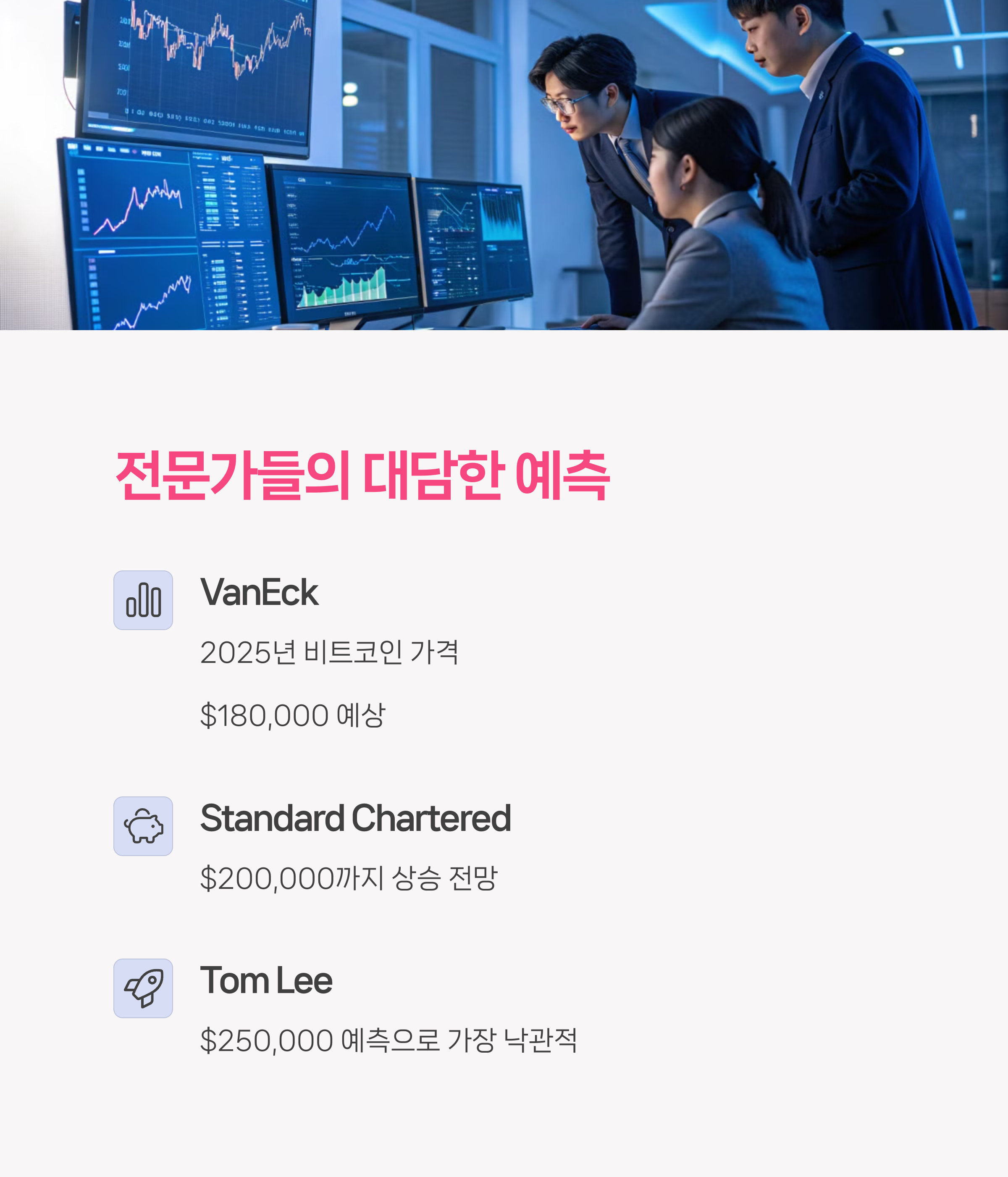 주요 전문가 및 기관들의 2025년 비트코인 가격 예측은 다음과 같습니다. VanEck은 $180,000, Standard Chartered는 $200,000, Tom Lee와 Tim Draper는 각각 $250,000까지 상승을 전망하고 있습니다.