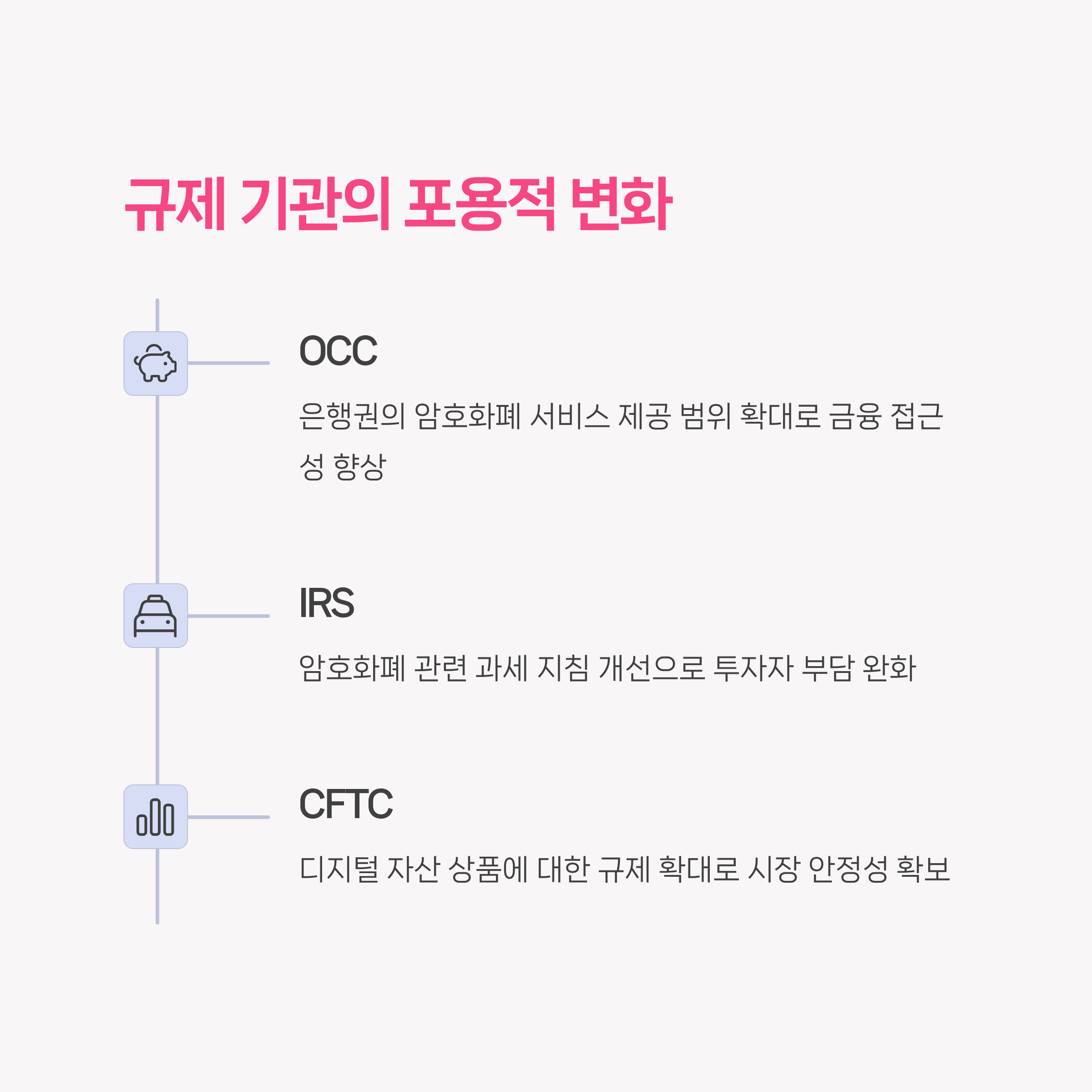 2025년 미국은 암호화폐 친화적인 정책 기조로 빠르게 전환 중입니다. 트럼프 행정부의 행정명령, SEC·OCC·IRS의 유연화, 그리고 비트코인 보유 결정 등은 시장에 긍정적인 신호로 작용하고 있습니다.