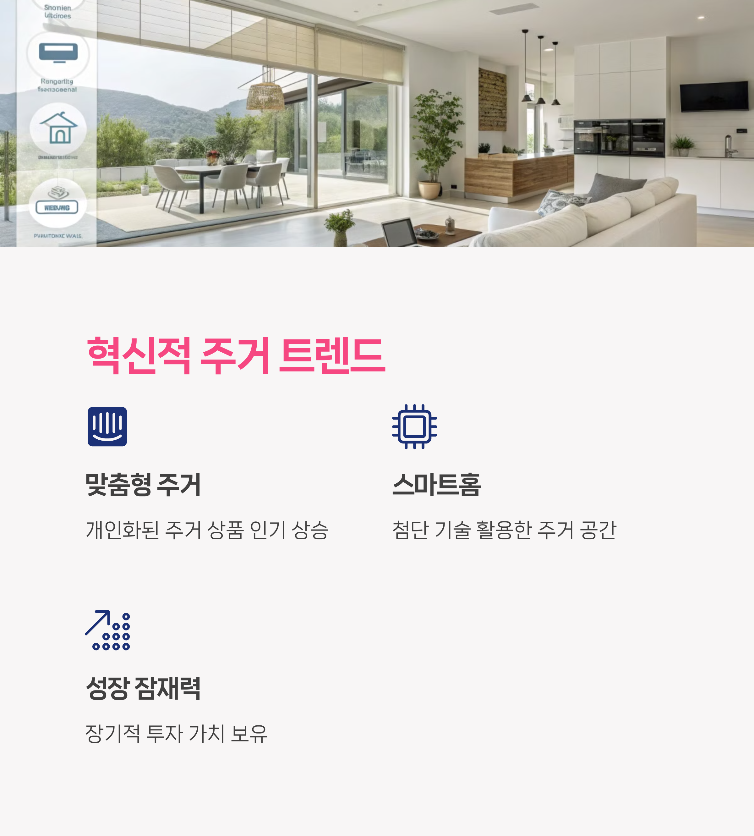 커스터마이징 홈, 고령자 맞춤형, 친환경 주거 공간 등은 장기적 수요와 사회적 가치까지 함께 고려한 새로운 투자 트렌드입니다.
