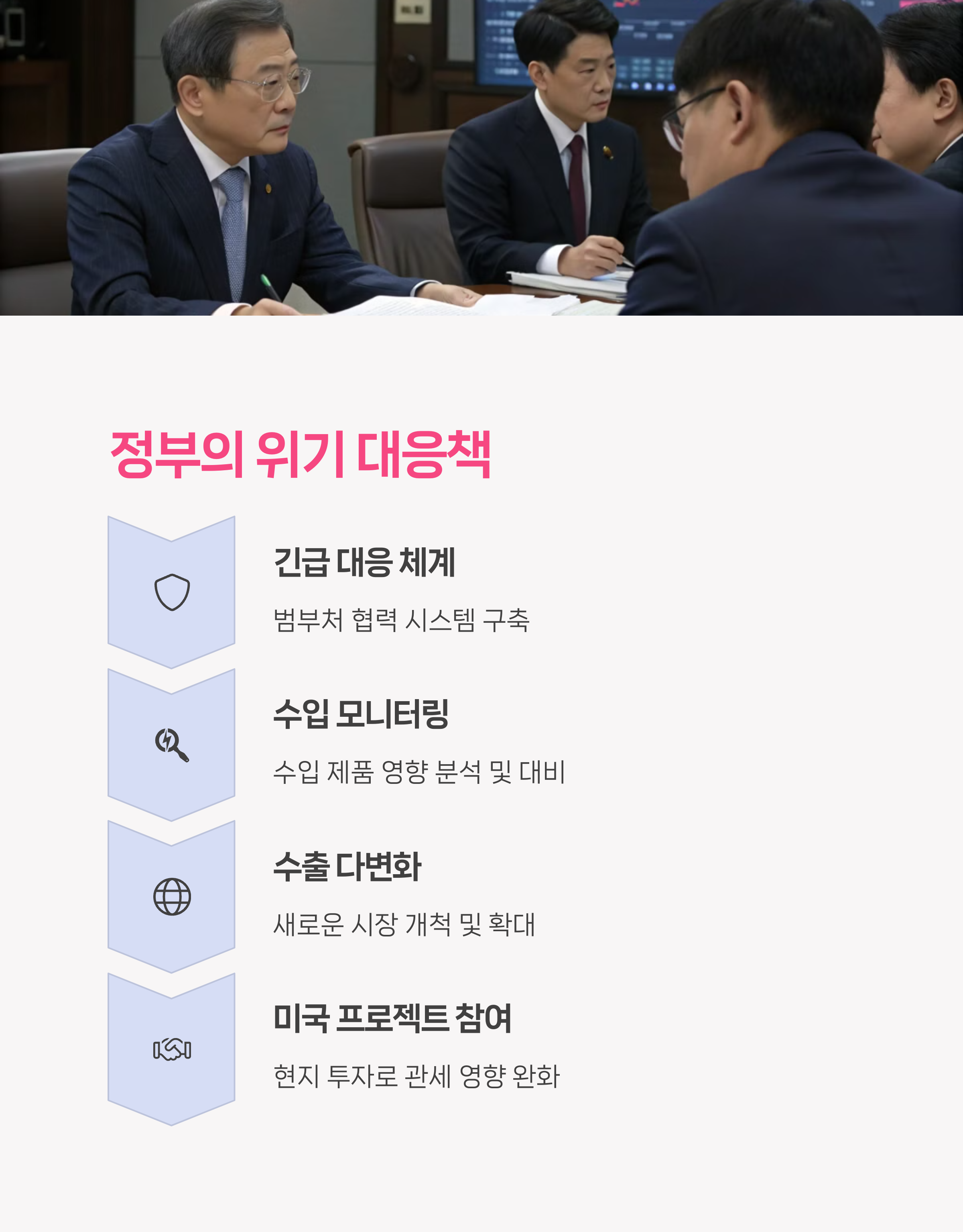 | 대응 전략 | 긴급 대응 체계, 수출 다변화, 외교적 협상 추진 |