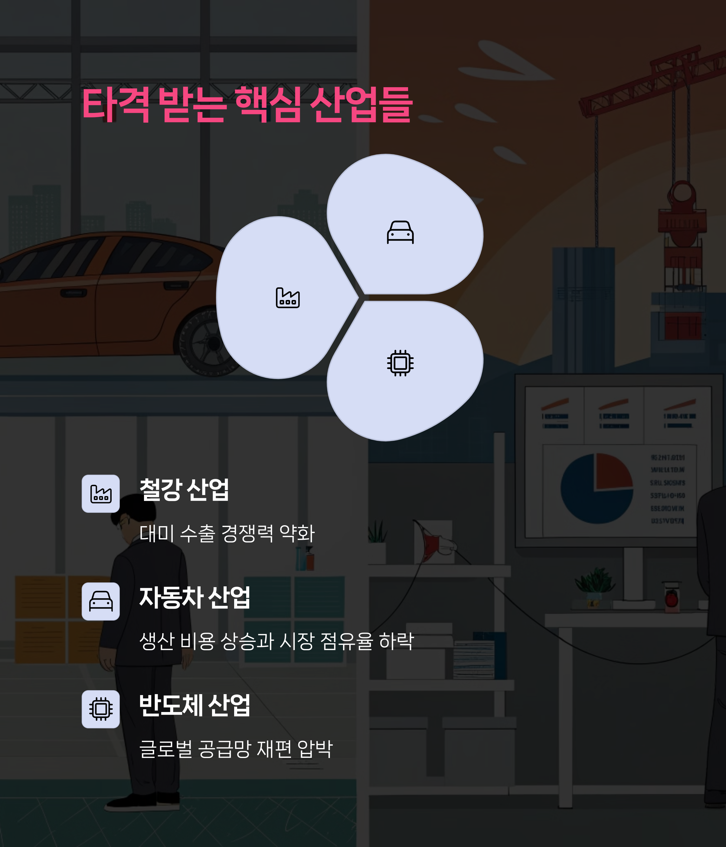 특히 철강, 자동차, 반도체 등 핵심 산업들이 타격을 입고 있으며, 국내 경제 성장률 전망까지도 하향 조정되고 있습니다.