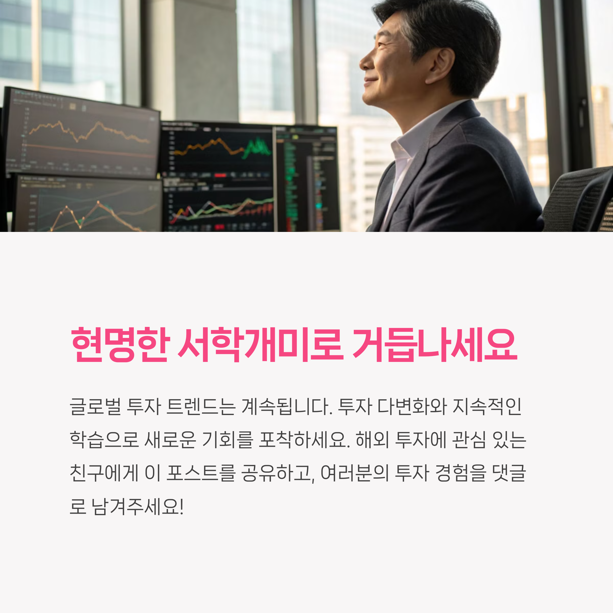 해외 주식 투자 열풍은 단순한 유행을 넘어 글로벌 자산 배분 시대의 흐름을 반영하고 있습니다. 특히 서학개미들의 성장은 한국 투자 문화의 지형을 바꾸는 핵심적인 변화로 평가받고 있으며, 앞으로도 그 영향력은 지속적으로 확대될 것입니다. 그러나 그에 따른 리스크 또한 무시할 수 없습니다. 고위험 상품 집중, 수수료 부담, 변동성 리스크 등은 투자자 개개인이 반드시 인지하고 대비해야 할 요소입니다. 건전한 투자 문화 확산과 글로벌 금융 리터러시 강화가 그 어느 때보다 중요한 시점입니다.