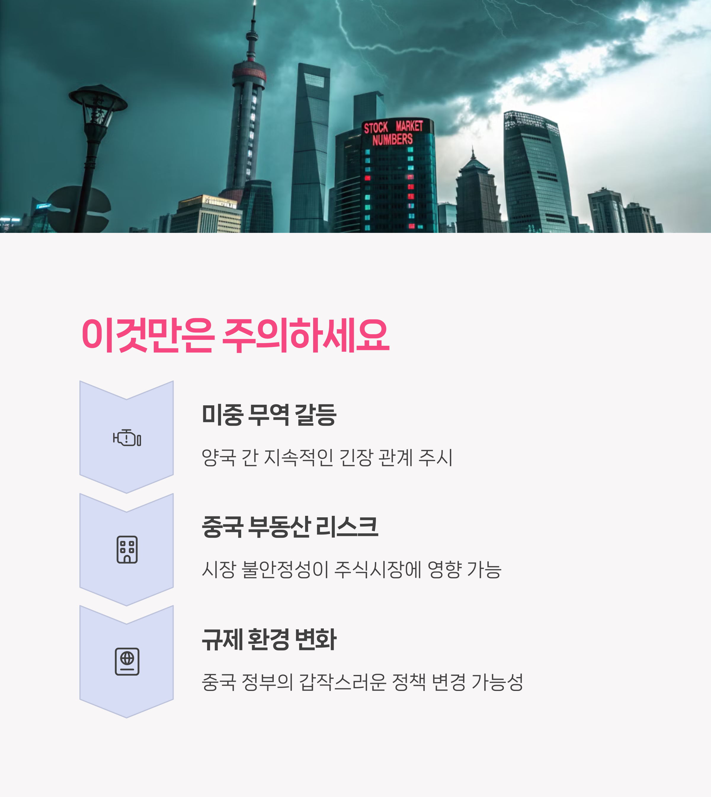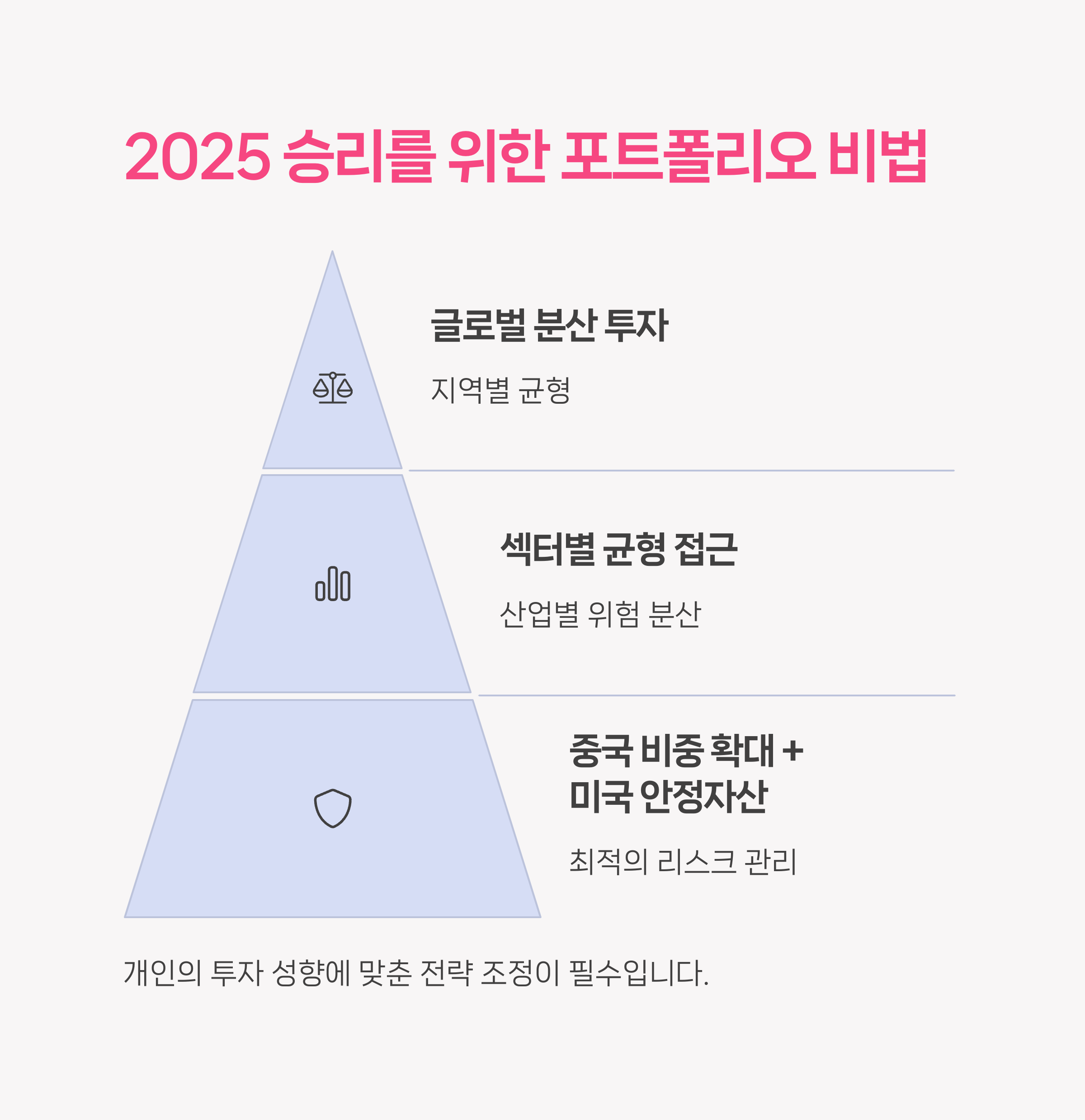 글로벌 투자자라면 2025년은 미국 시장 일변도에서 벗어나 중국 및 신흥국 자산 분산을 고려할 시기입니다. 중국 내에서는 AI·첨단 제조·친환경 산업이 유망 분야로 떠오르고 있으며, 미국 내에서는 중소형주, 가치주 중심의 선택적 접근이 필요합니다. 또한 인도, 동남아 등 성장 잠재력이 높은 지역도 적극 검토해볼 만한 대안 시장입니다.