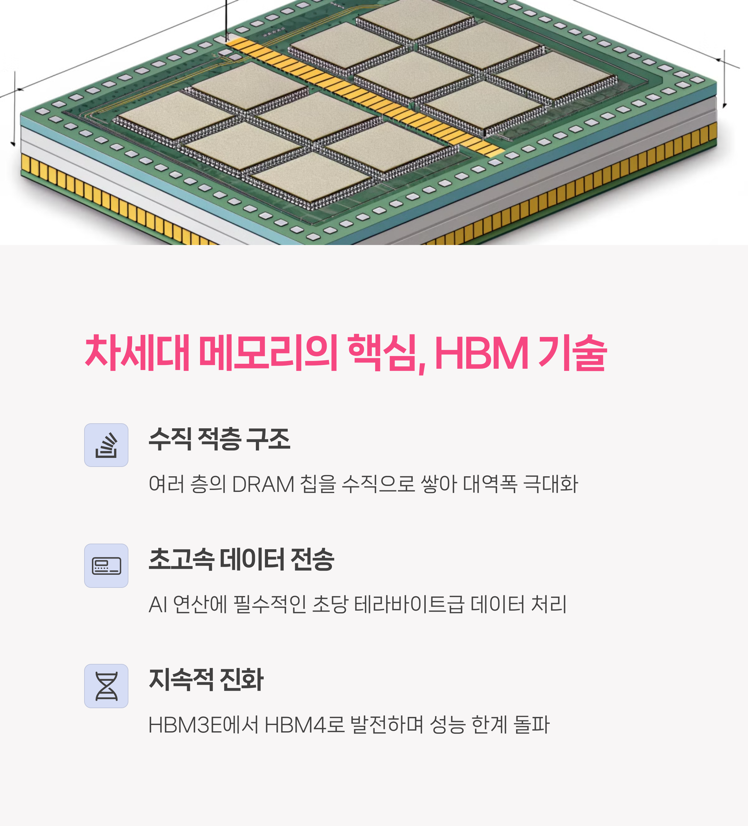 고속 데이터 전송과 3D 스택 기술 기반 | AI 연산 성능 향상에 필수적 요소로 작용 |