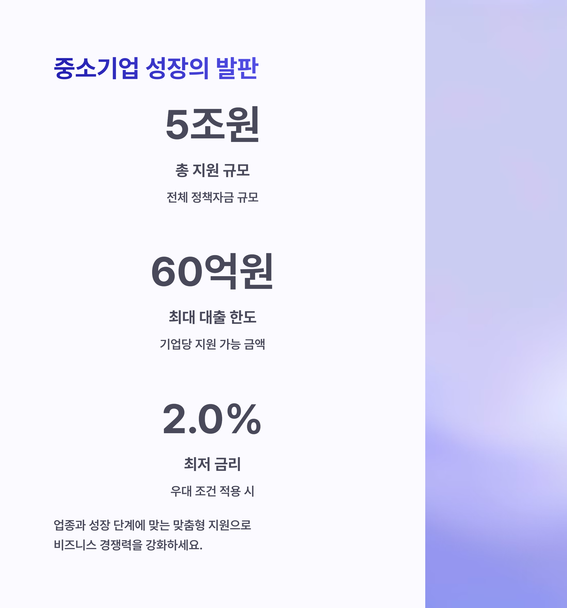 | 중소기업 정책자금 | 최대 60억 원, 예산 소진 시까지 접수 |