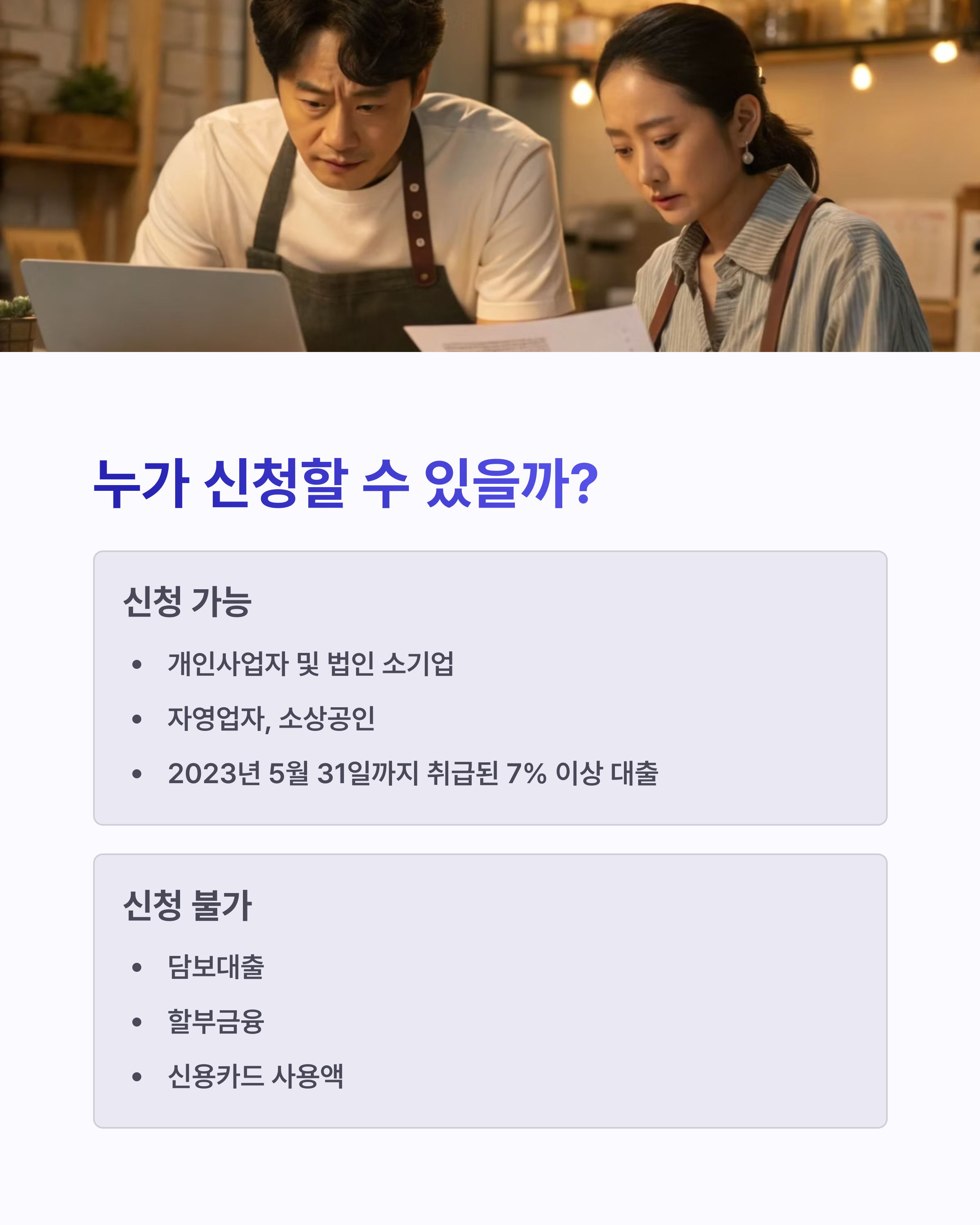 신청 전에는 반드시 조건을 꼼꼼히 확인하는 것이 중요합니다. 특히 본인의 대출이 ‘사업 목적’에 부합하는지 여부가 핵심이에요.