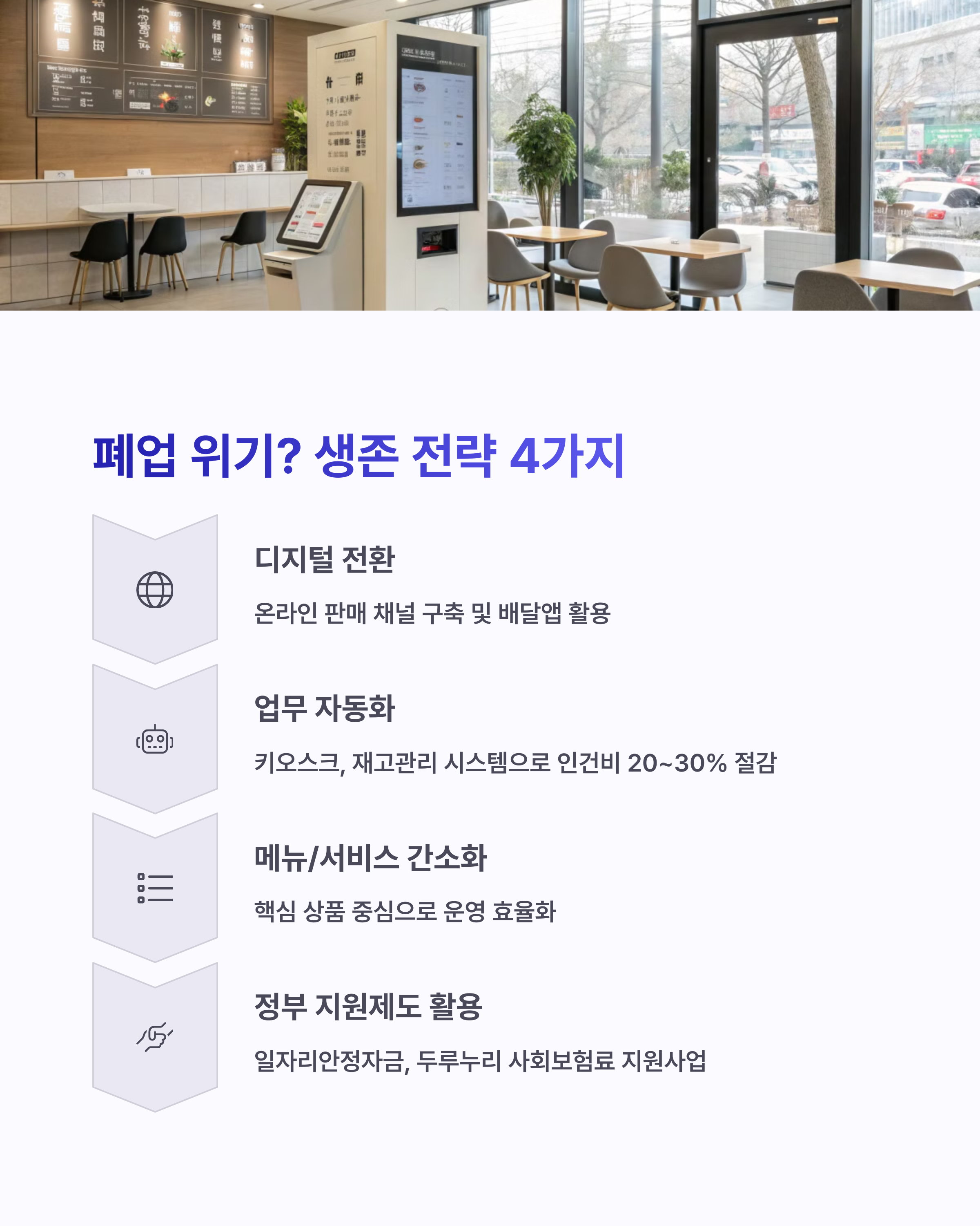 자동화 도입, 비용 절감, 정부 지원 활용, 온라인 전환이라는 전략을 조합한다면 위기를 기회로 바꿀 수 있습니다.