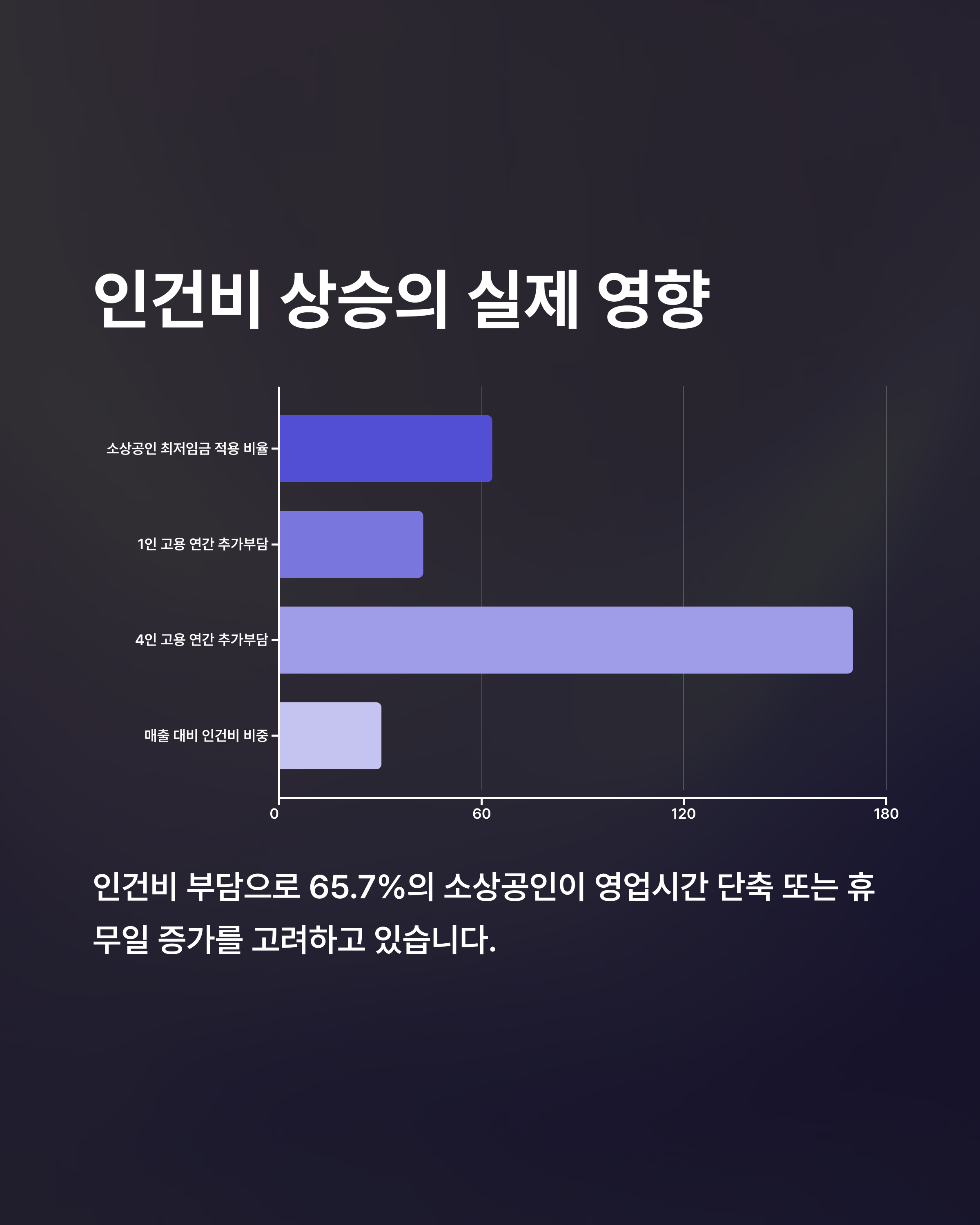 특히 인건비 외에도 임대료, 원자재, 유류비 등의 고정 지출이 계속 오르는 상황에서 최저임금 인상은 순이익 감소로 직결되며 경영 위기를 가중시키고 있습니다.