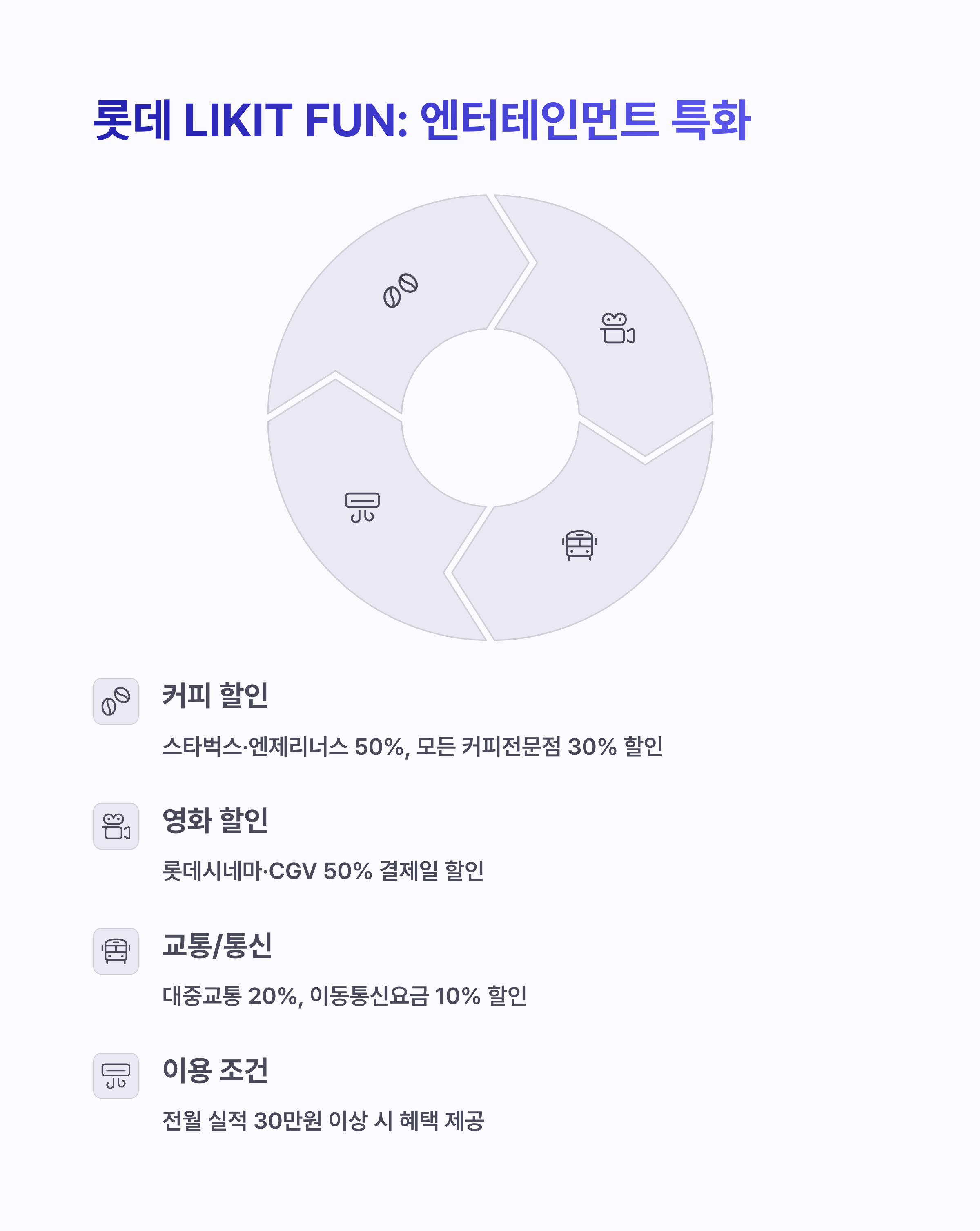 롯데카드 LIKIT FUN | OTT·배달앱 할인, 커피 추가 할인 | 국내 12,000원 / 해외 15,000원 | MZ세대 소비 성향 맞춤 |