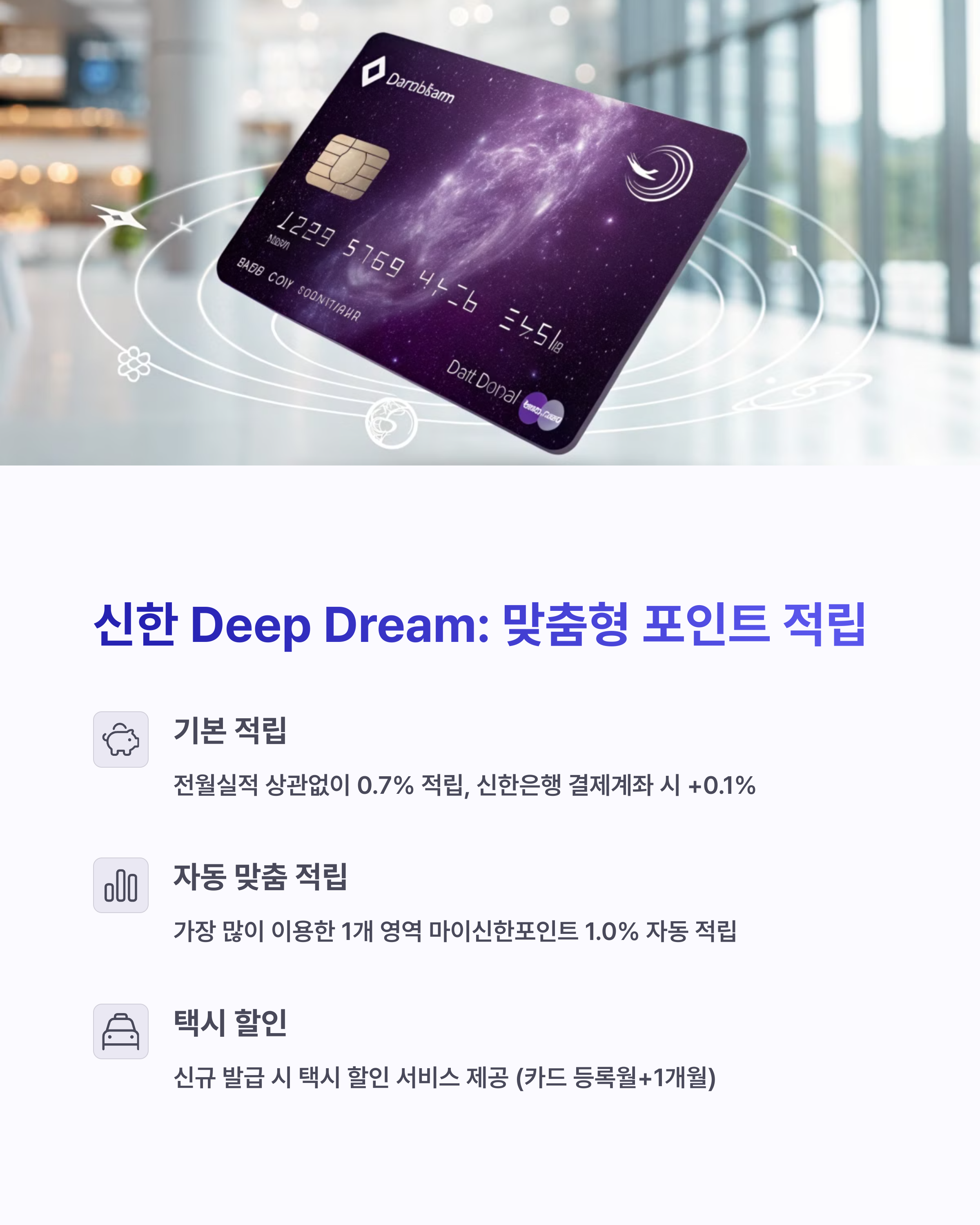 신한카드 Deep Dream | 모든 가맹점 포인트 + 교통 추가적립 | 국내 10,000원 / 해외 12,000원 | 균형 잡힌 혜택 설계 |
