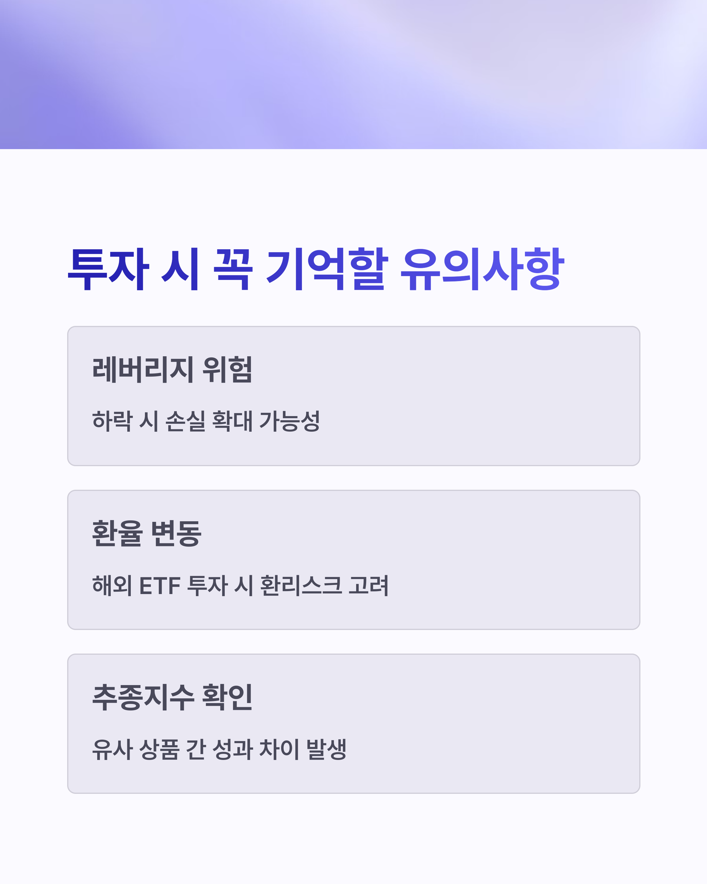 ETF는 분산 투자와 비용 효율성이 높다는 장점이 있지만, 전략별 리스크도 반드시 인지해야 합니다.