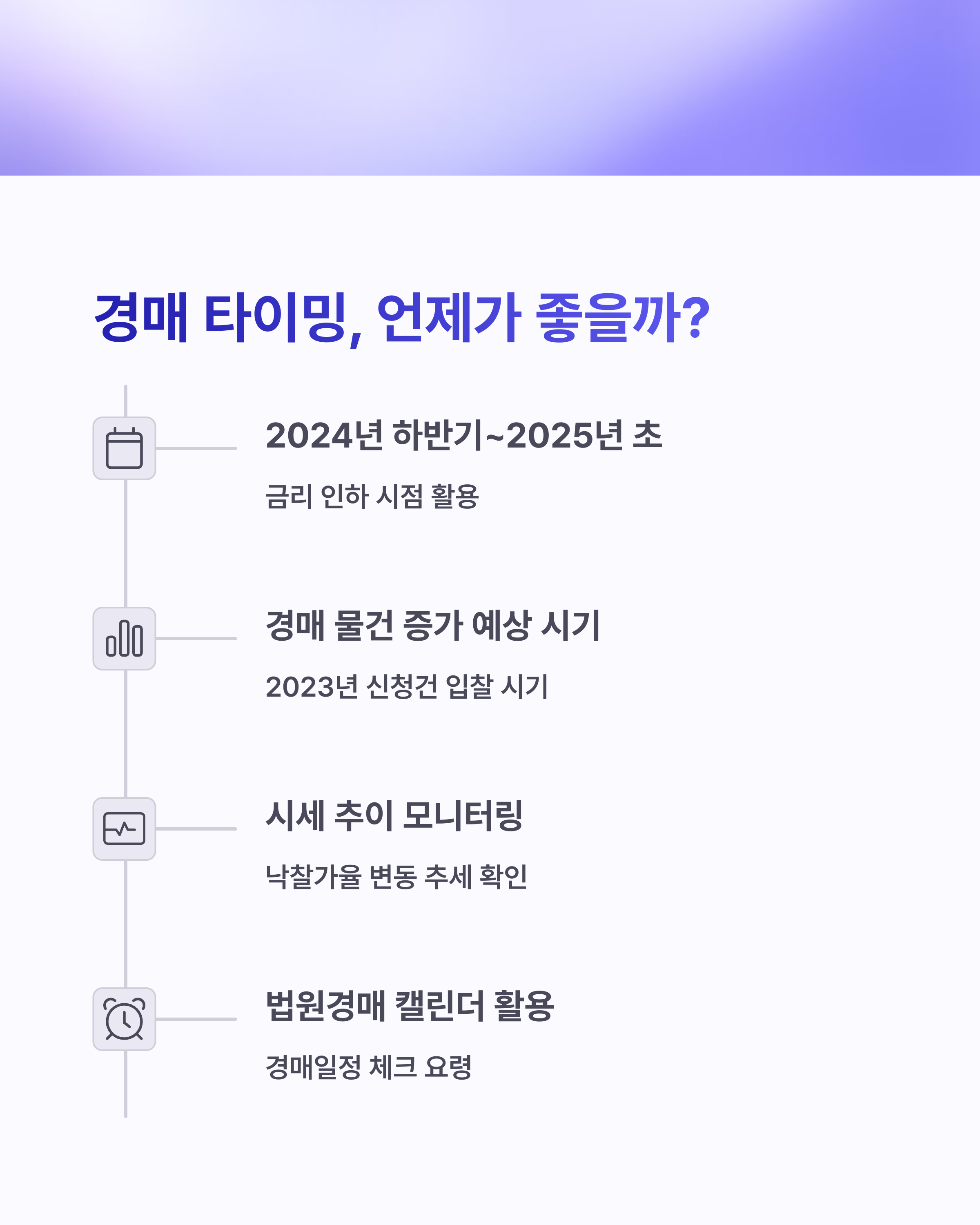 일반적으로 연말에서 이른 봄 사이가 경매 시장의 비수기로, 이 시기에 경쟁률이 낮고 유리한 가격에 낙찰될 확률이 높아집니다. 입찰 전에 반드시 시세 분석과 자금 계획을 마친 상태에서, 최저가 입찰 전략으로 접근하는 것이 바람직합니다.