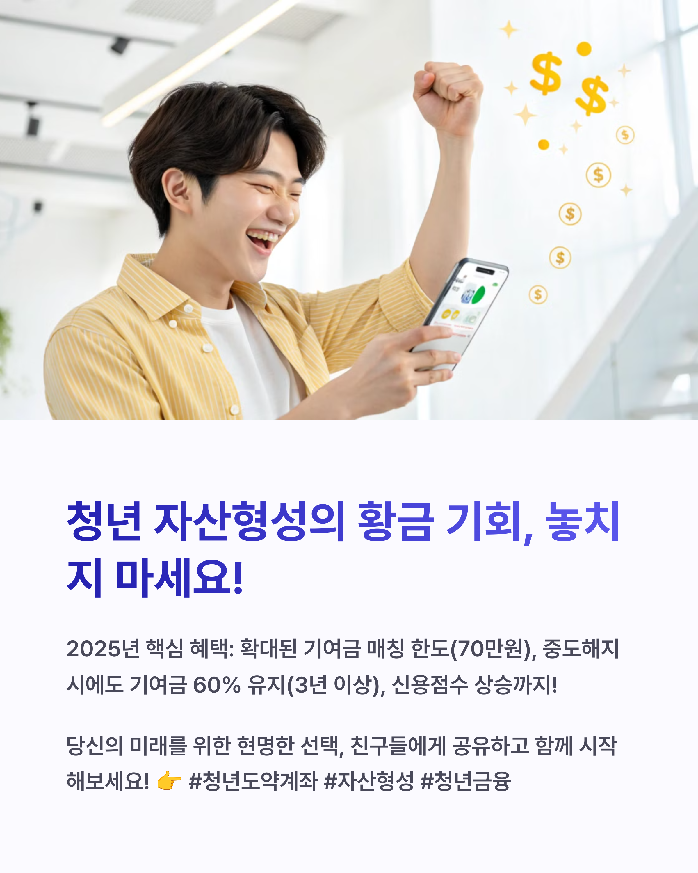 ⚠️ 주의: 정부 지원금은 중도 해지 시 일부 또는 전액 환수될 수 있습니다. 최소 5년간 유지하는 것을 전제로 지원금이 제공되므로 계획적인 저축이 중요합니다.