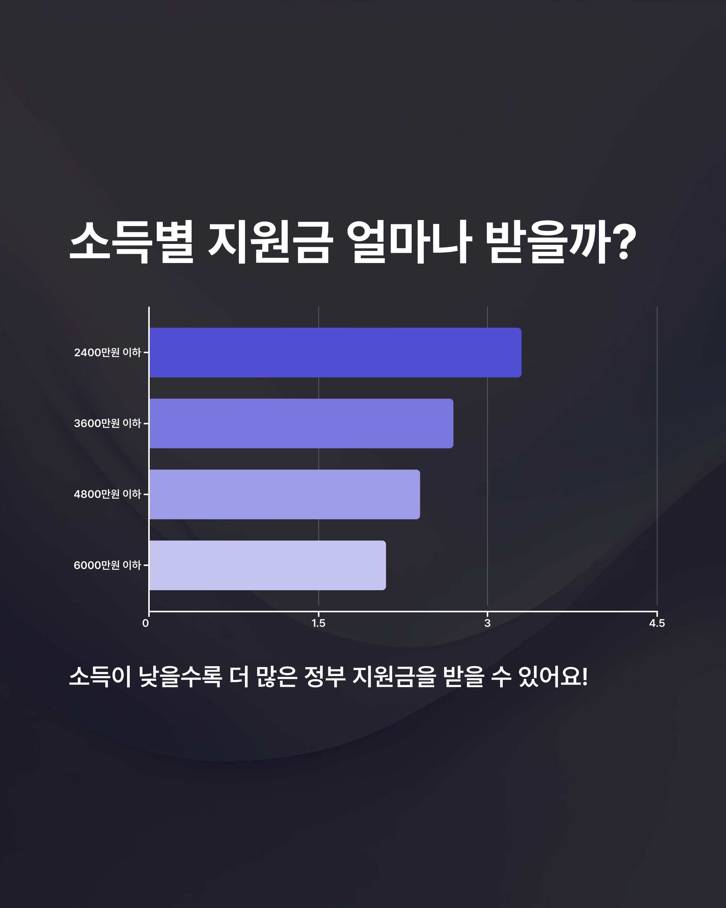 예를 들어 연소득이 2,400만 원 이하라면 최대 금액의 지원금을 받을 수 있고, 소득이 높아질수록 중간 수준 또는 최소 수준의 지원금으로 차등 적용됩니다.