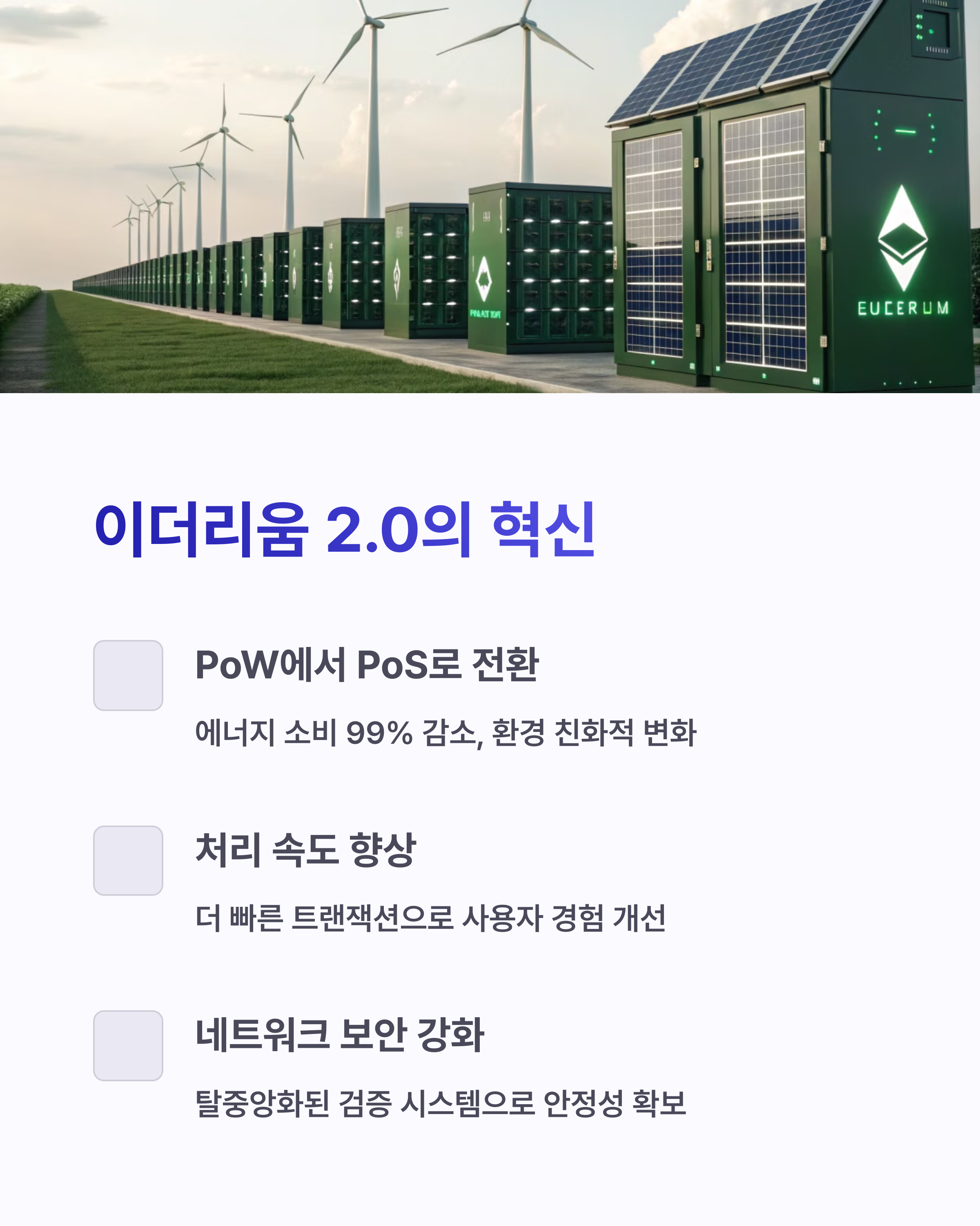 - PoS 전환: 채굴 대신 지분 기반의 검증 방식으로 에너지 사용 99% 감소